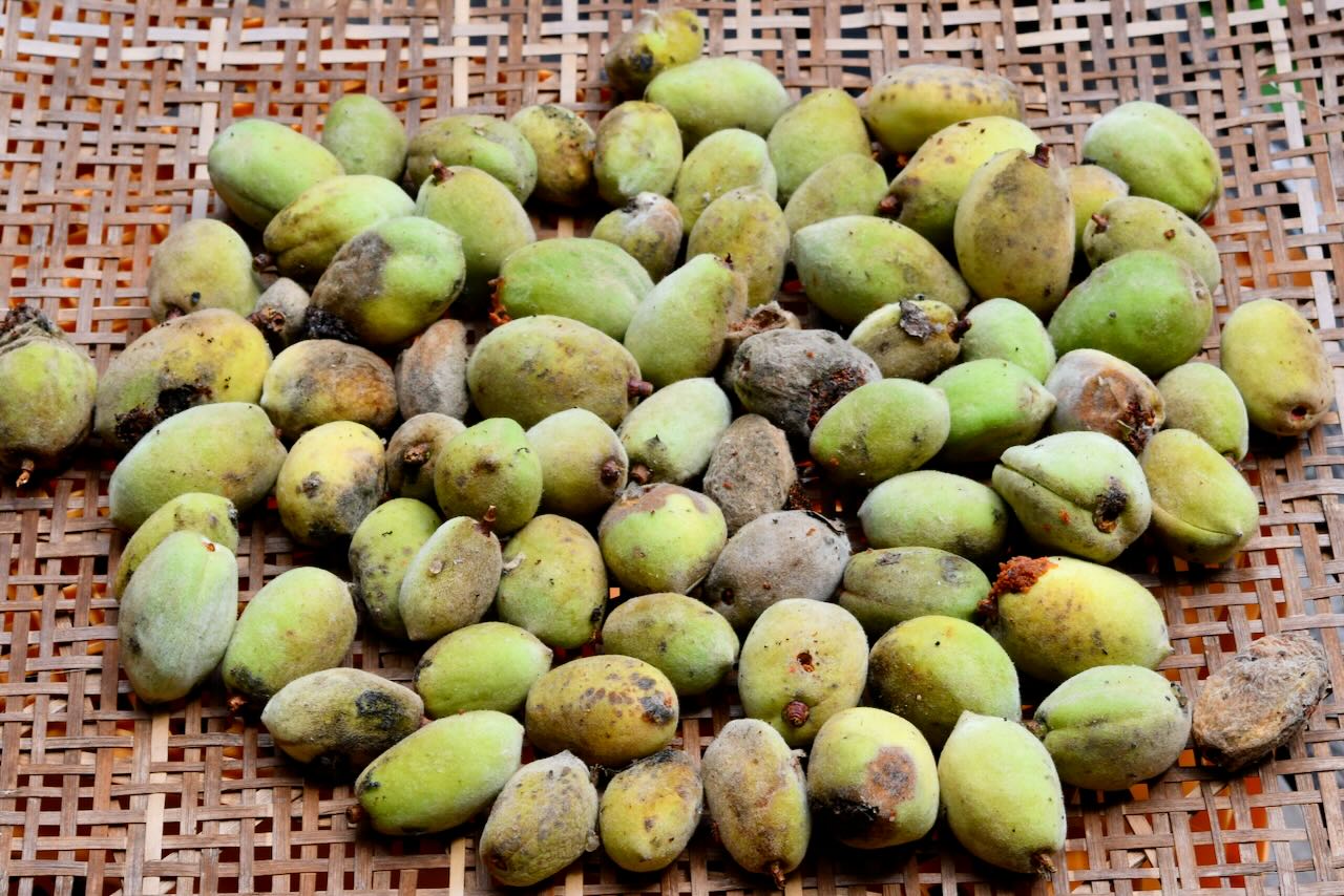 元職員の友人の家のアーモンドの実を中村君が収穫して来てくれました。青い果肉を取り、出て来た殻を乾燥させてくるみ割り器などで割ります。その中の仁(種子)を取り出しローストします。生でも食べられますが、私はフライパンで炒って食べます。