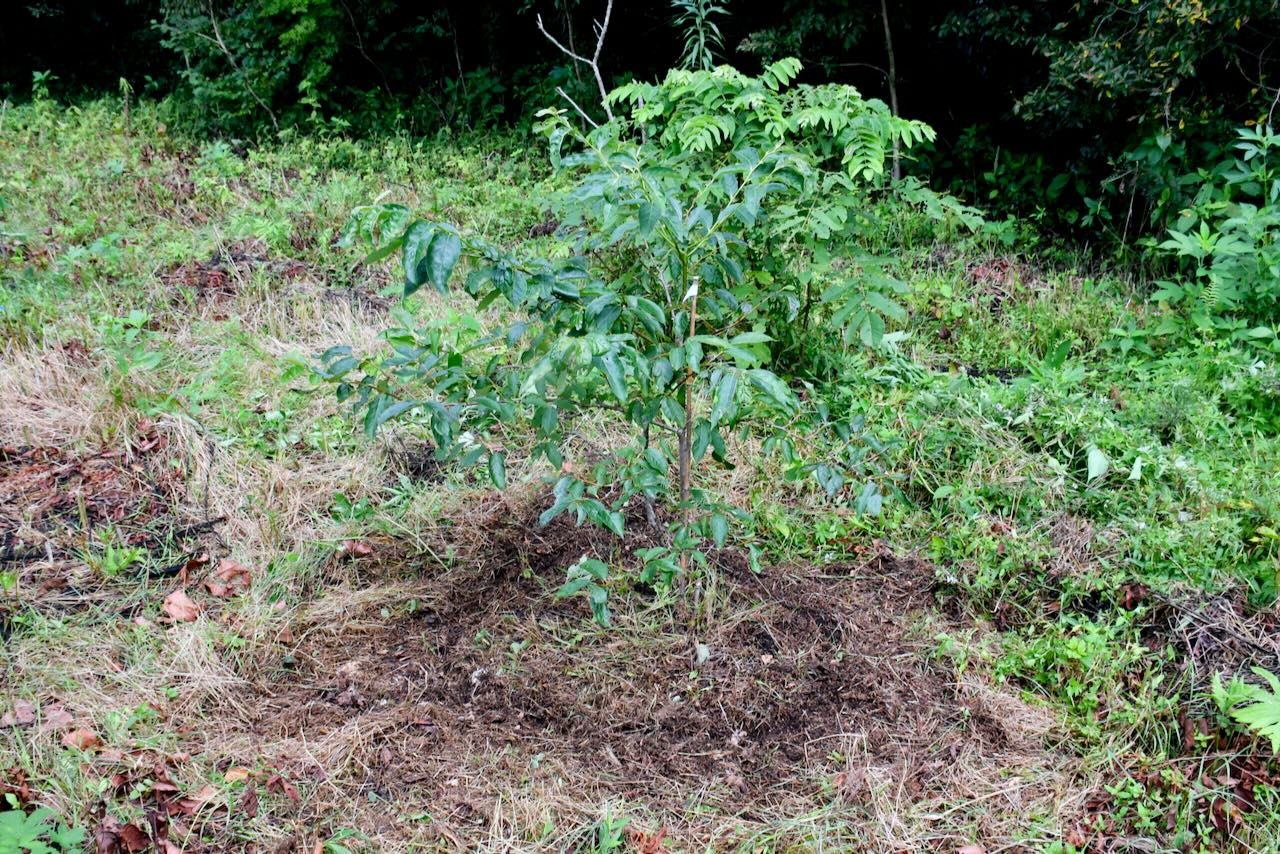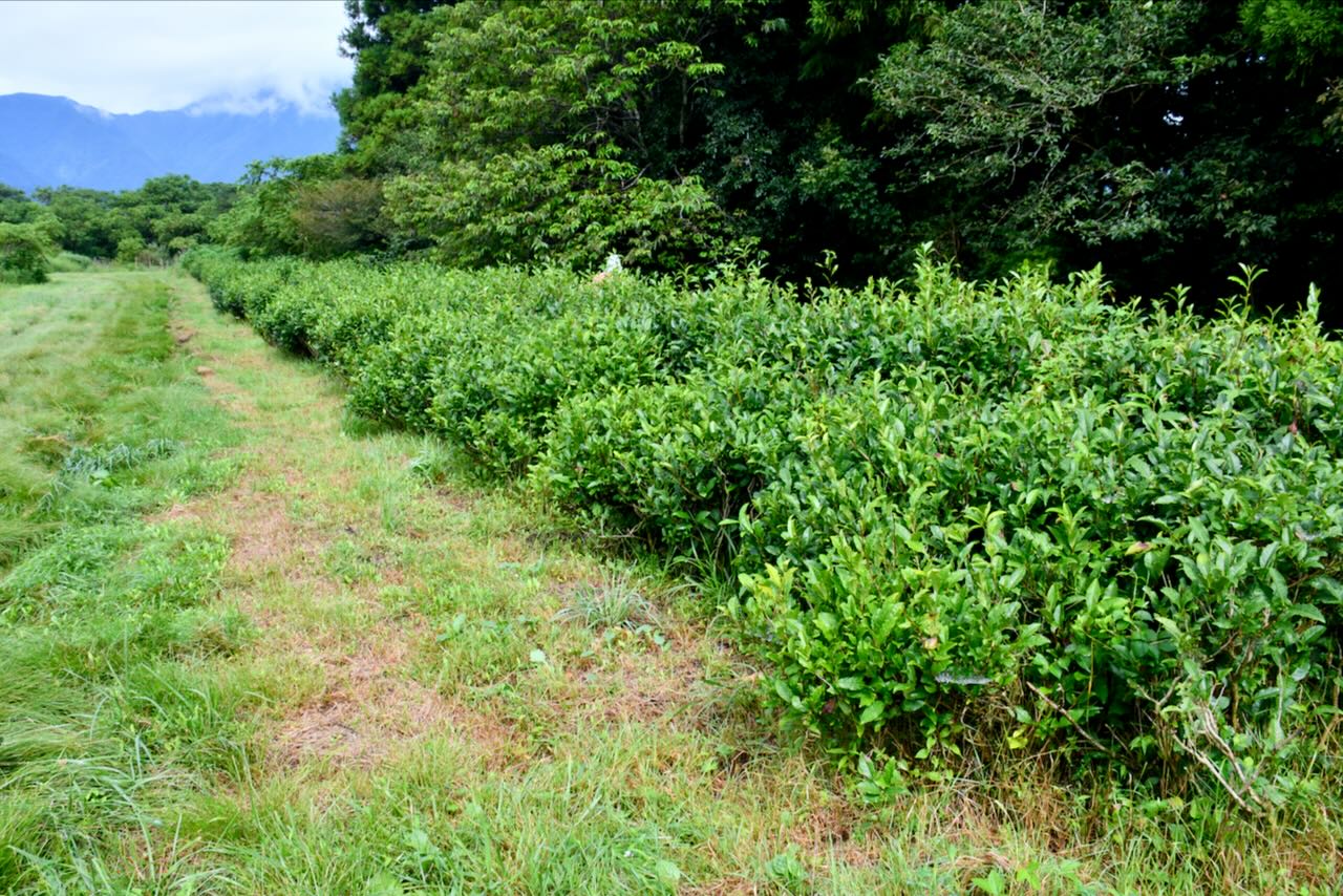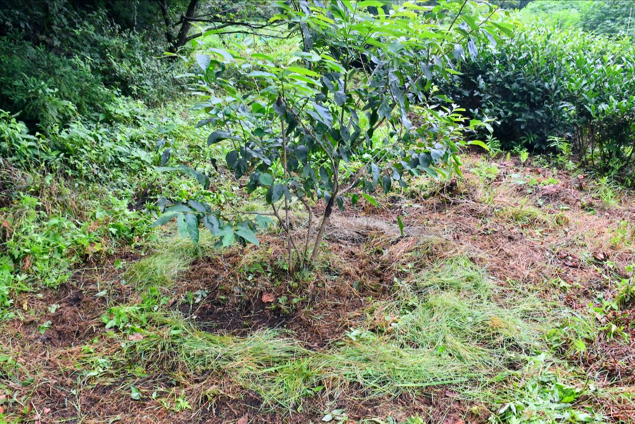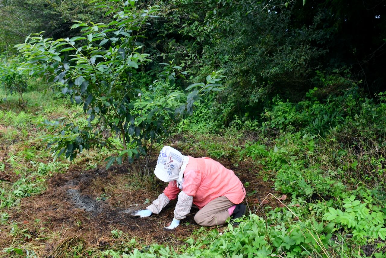 茶の木と右の林の間に、アマンドウを10本移植しています。その中の2本の木の周りにも種を蒔きました。