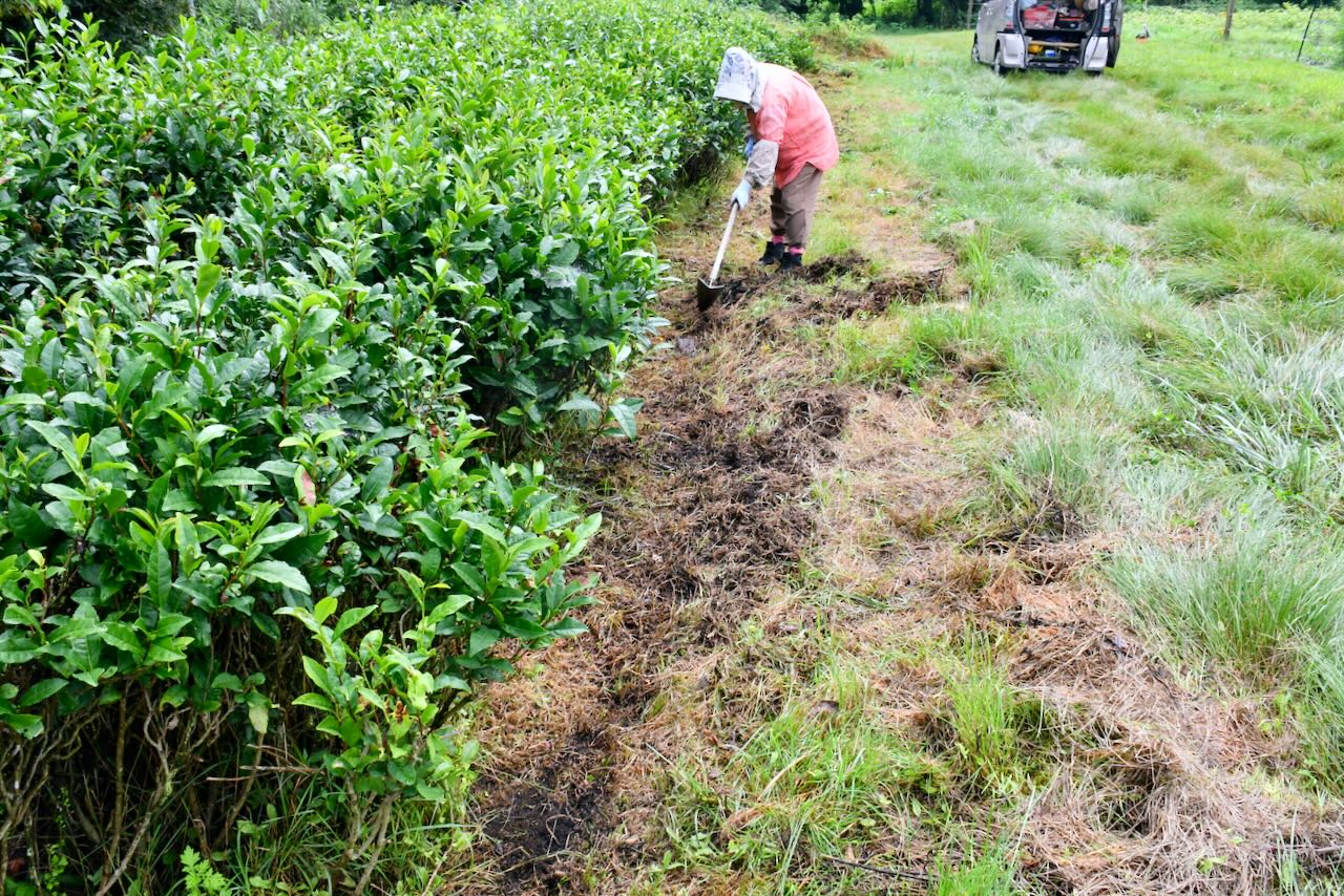 周りの草を取り除き、鎌でスジを入れました。