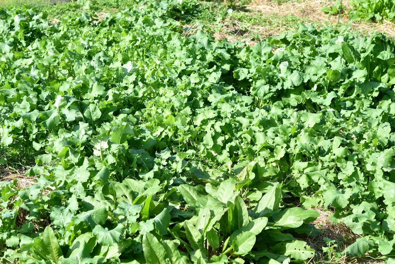 5段目の富士協生果樹農園が借りている畑は、相変わらずカキナがこぼれ種から育って自生しています。カキナの手前と右奥には小松菜も自生しています。