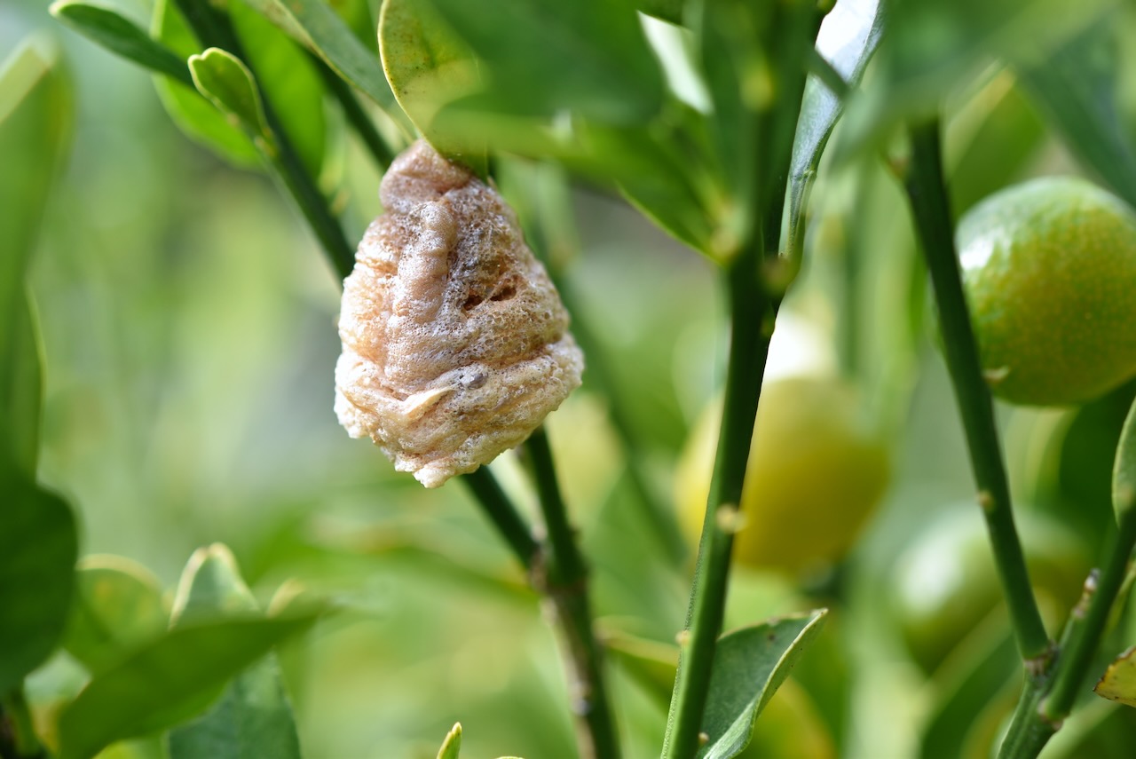 キンカンの木にカマキリのたまごがたくさん付いていました。実はほんのり色づいてきたので食べてみると、酸っぱいですが甘みもあって美味しかったです。