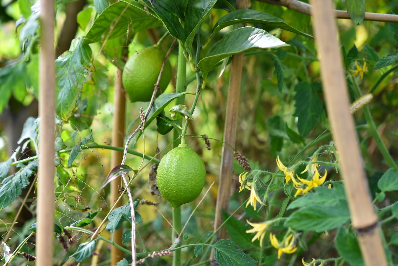 小さなレモンの実が2個出来ていました。トマトに埋もれてしまっていました。