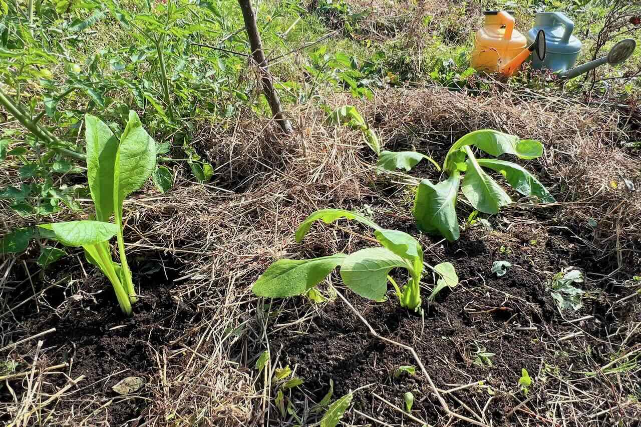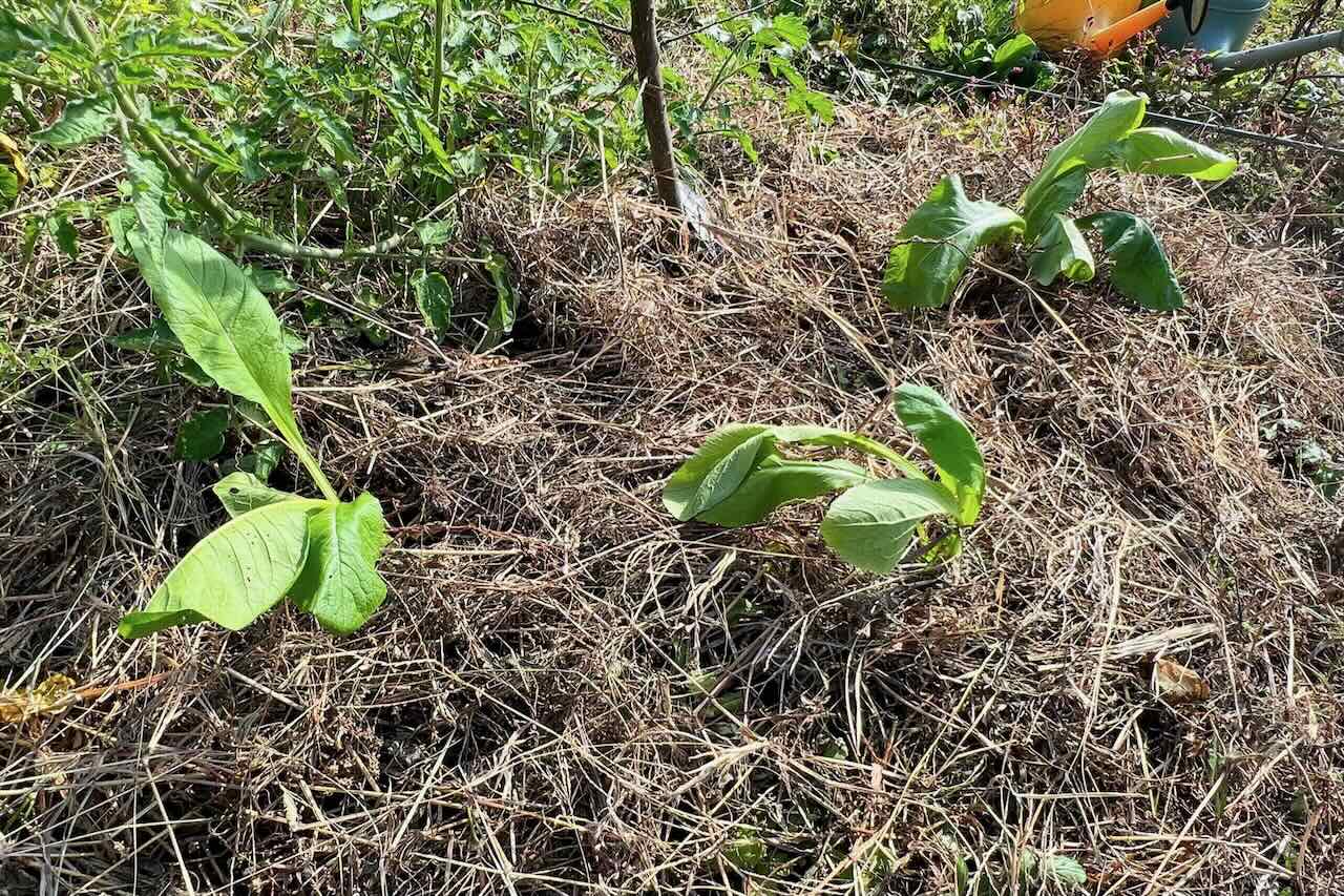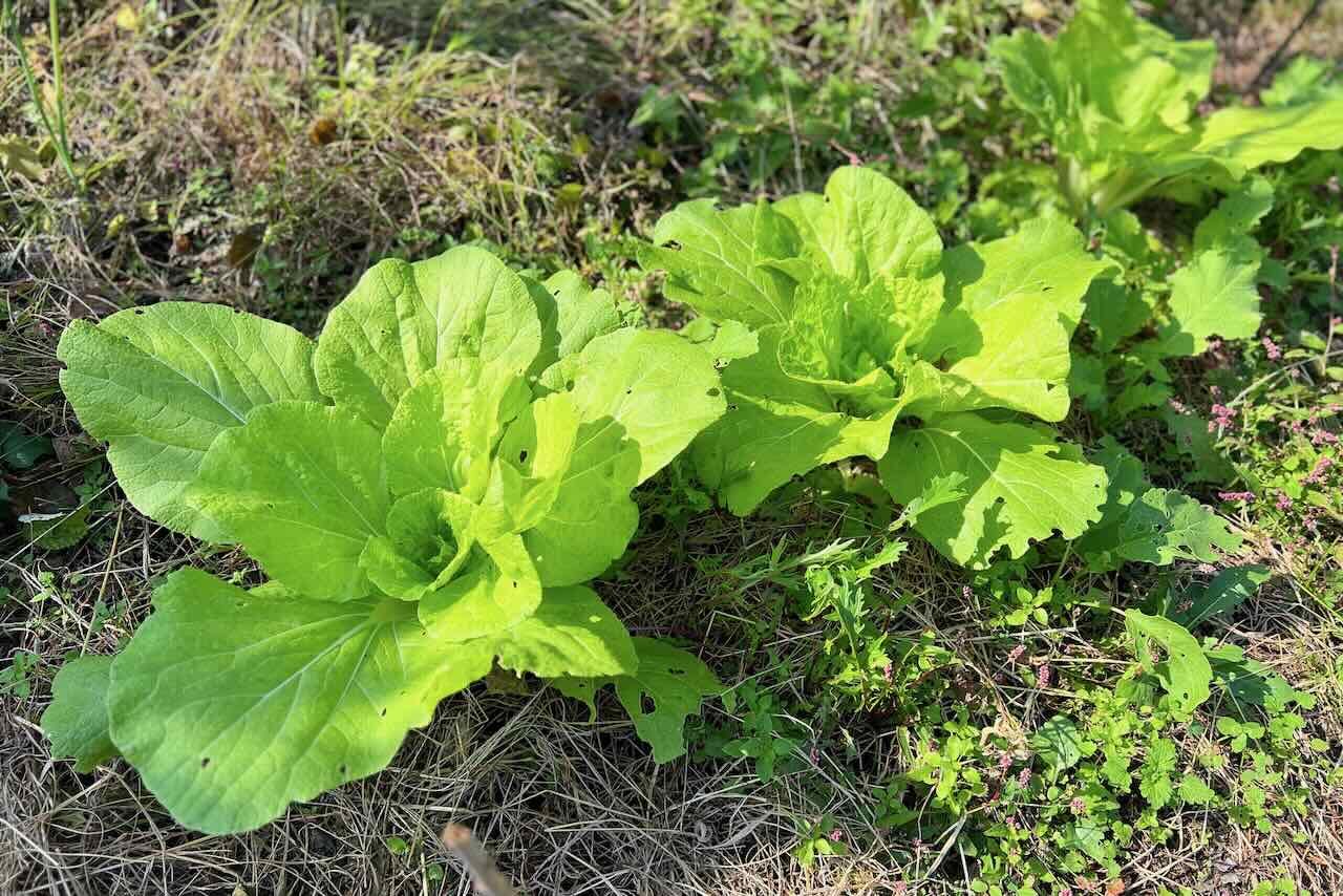 大きな畑の協生キット5〜6箇所に白菜を移植しました。枯れた草を押し分けて植えた後、