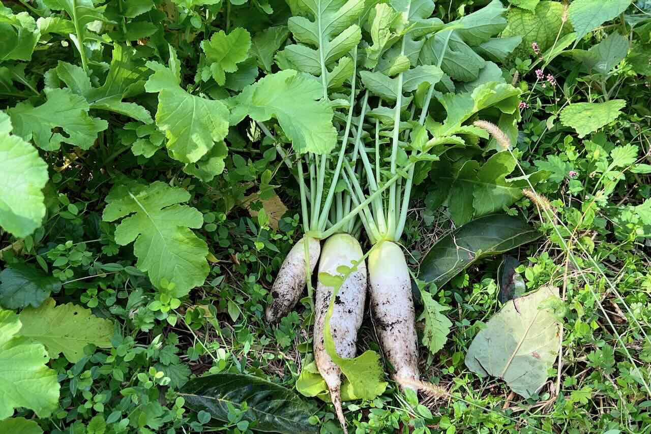 12日に野人さんが視察と講習に来られるのですが、夕食に猪汁を作ります。その時の具材に使う大根を収穫しています。私の大根は小さすぎるので(右側)、4段目の富士協生果樹農園の大根を取りました。左の大きいサイズ3本です。この大根もこぼれ種から育ったもので、通路にこぼれた種が元気で大きくなっていました。大根の他、協生農法のサトイモ、冬瓜、ネギも使います。美味しく出来上がって欲しいです。大根の葉はおにぎりに使います。
