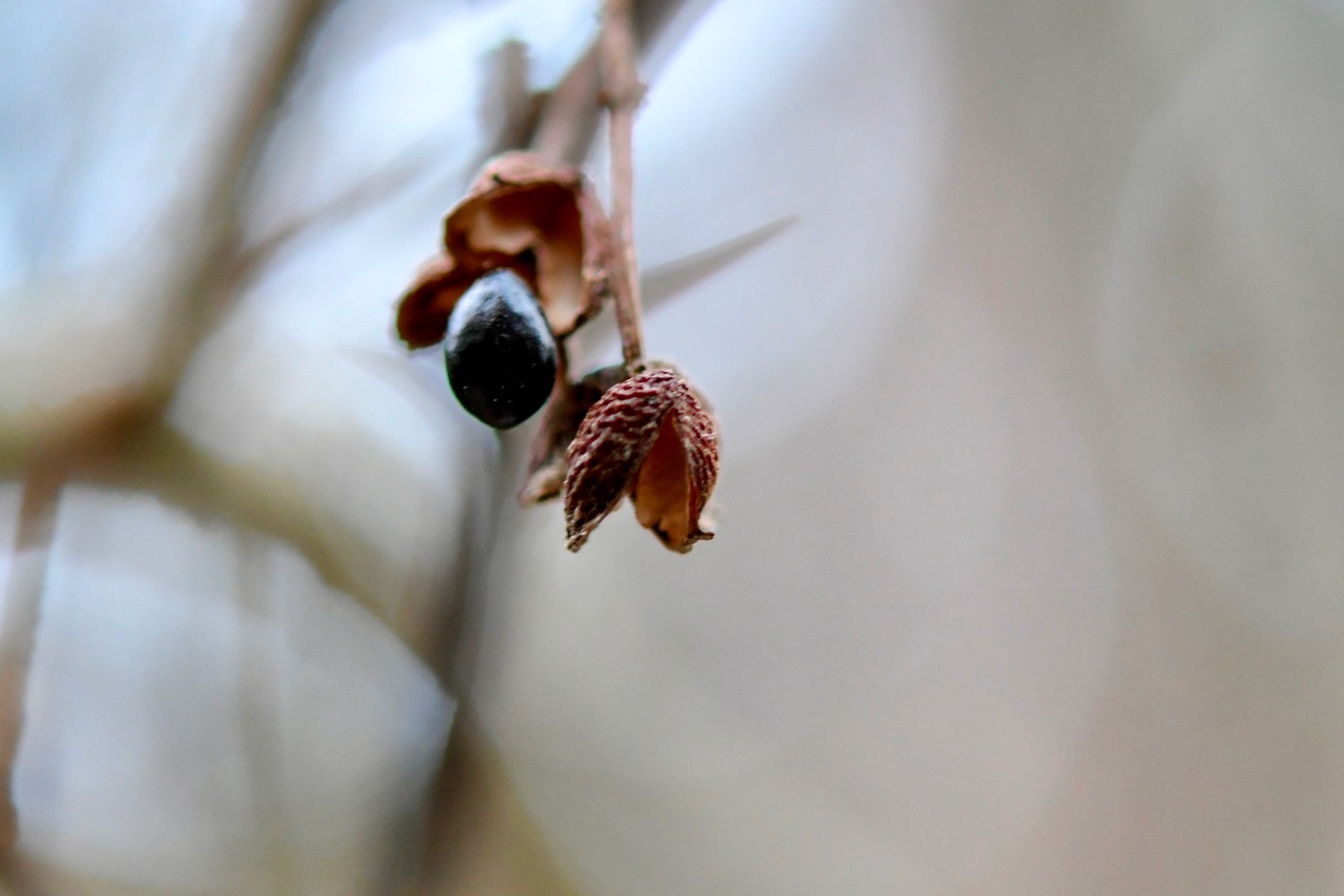 まずは春から秋までお世話になったサンショウの木を見に行きました。葉は一枚もなく、実も種もほとんど落ちていましたが、何粒か殻にくっついたままの種が残っていました。この一粒の大きさは5mmにも満ちません。