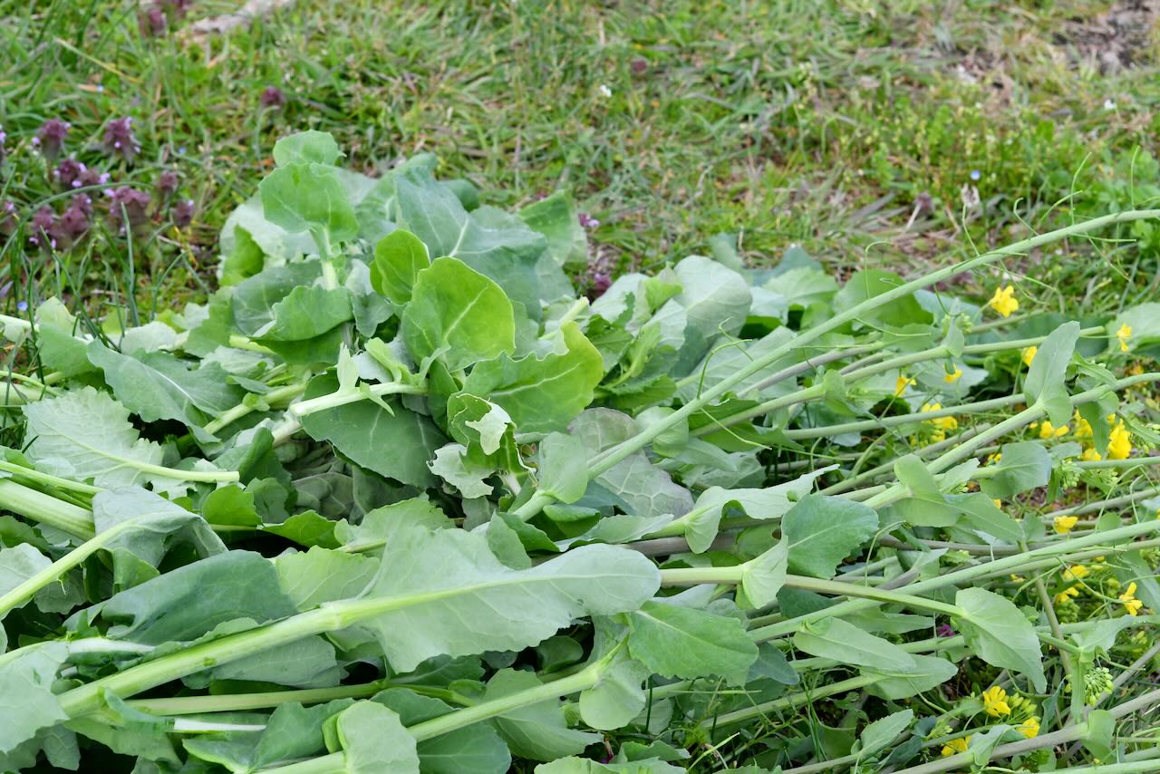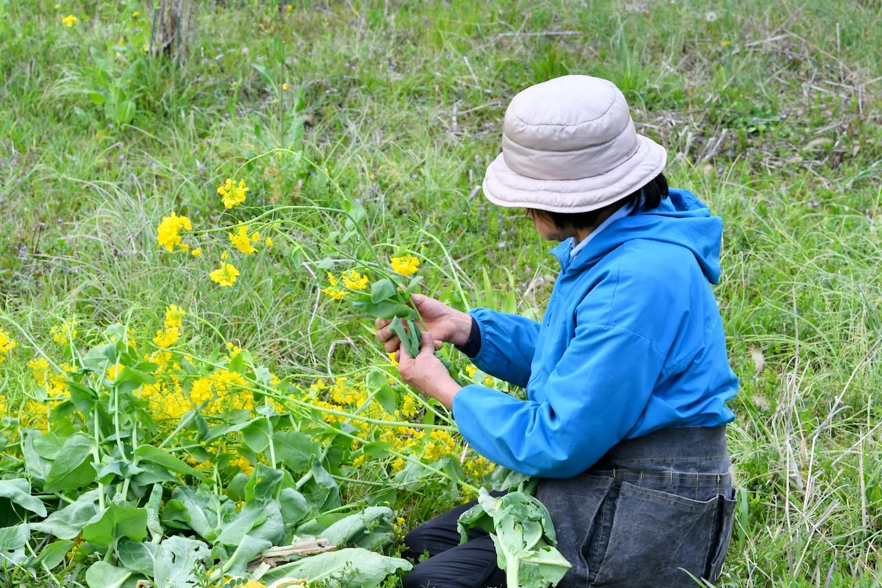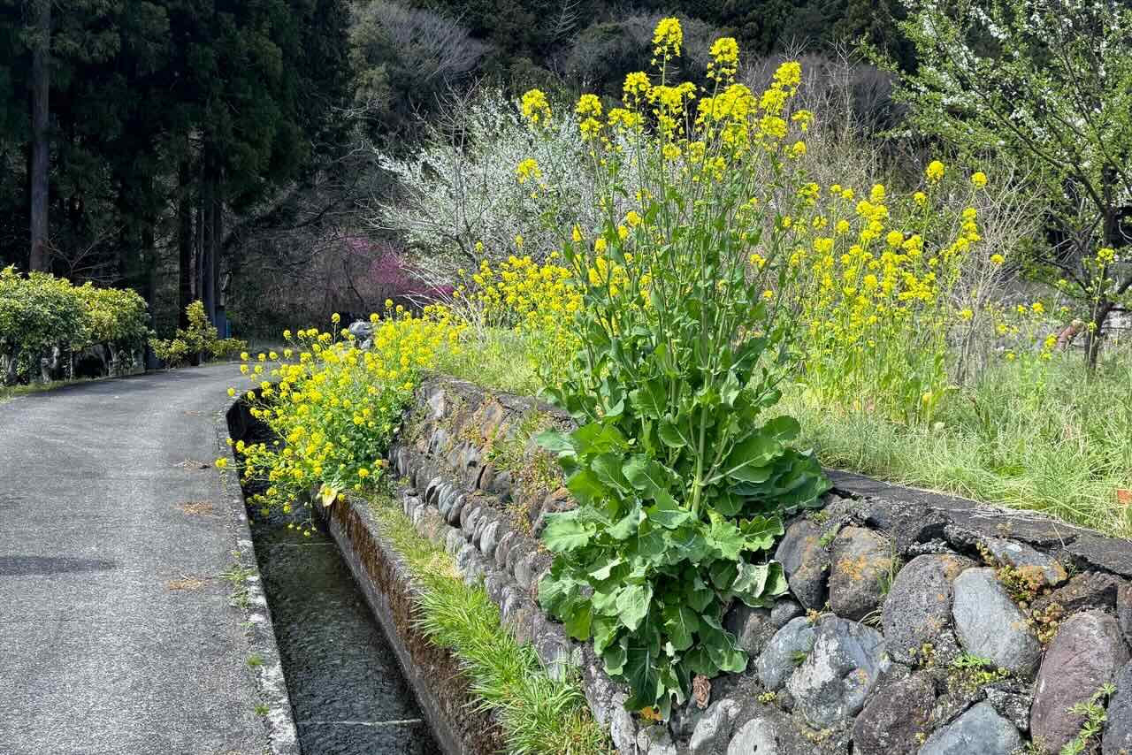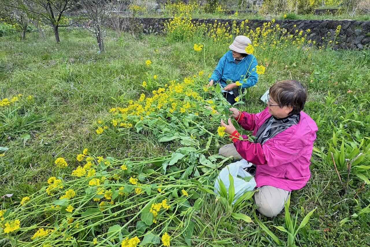 5段目の畑の下の石垣から菜花が生えています。このままだと隣の畑の人が種が飛んでくるのを心配するので、刈り取る事にしました。