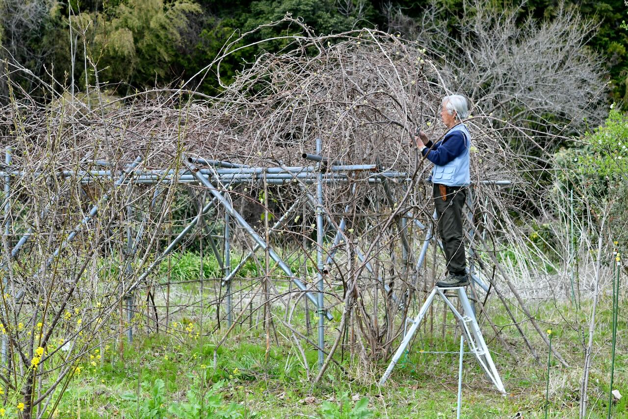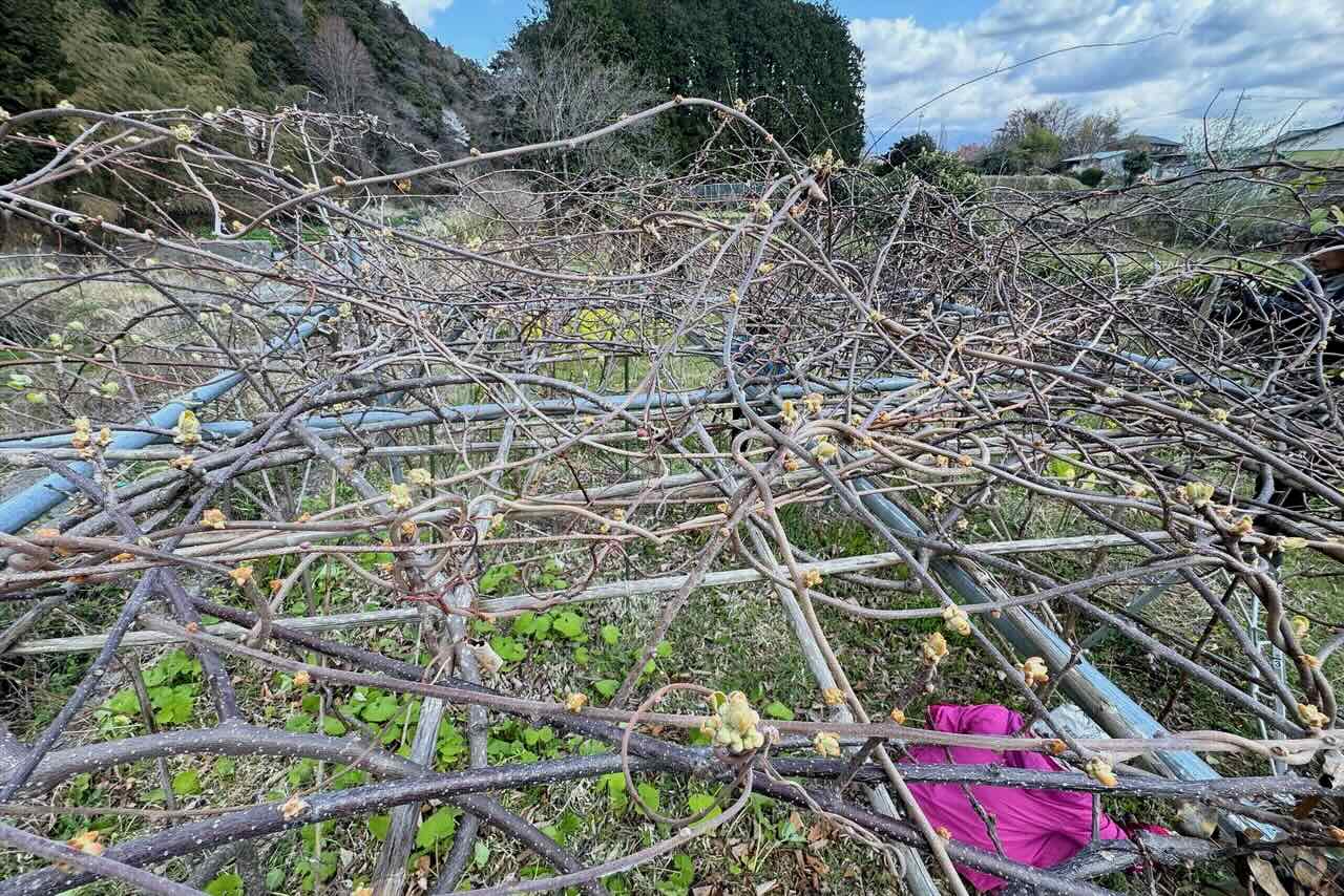 梅の古木があるの女性陣の畑のキウイの棚です。