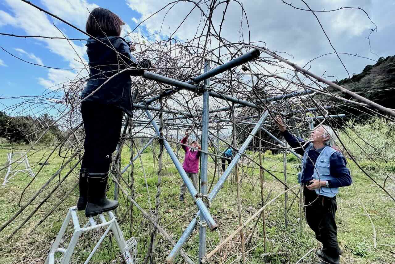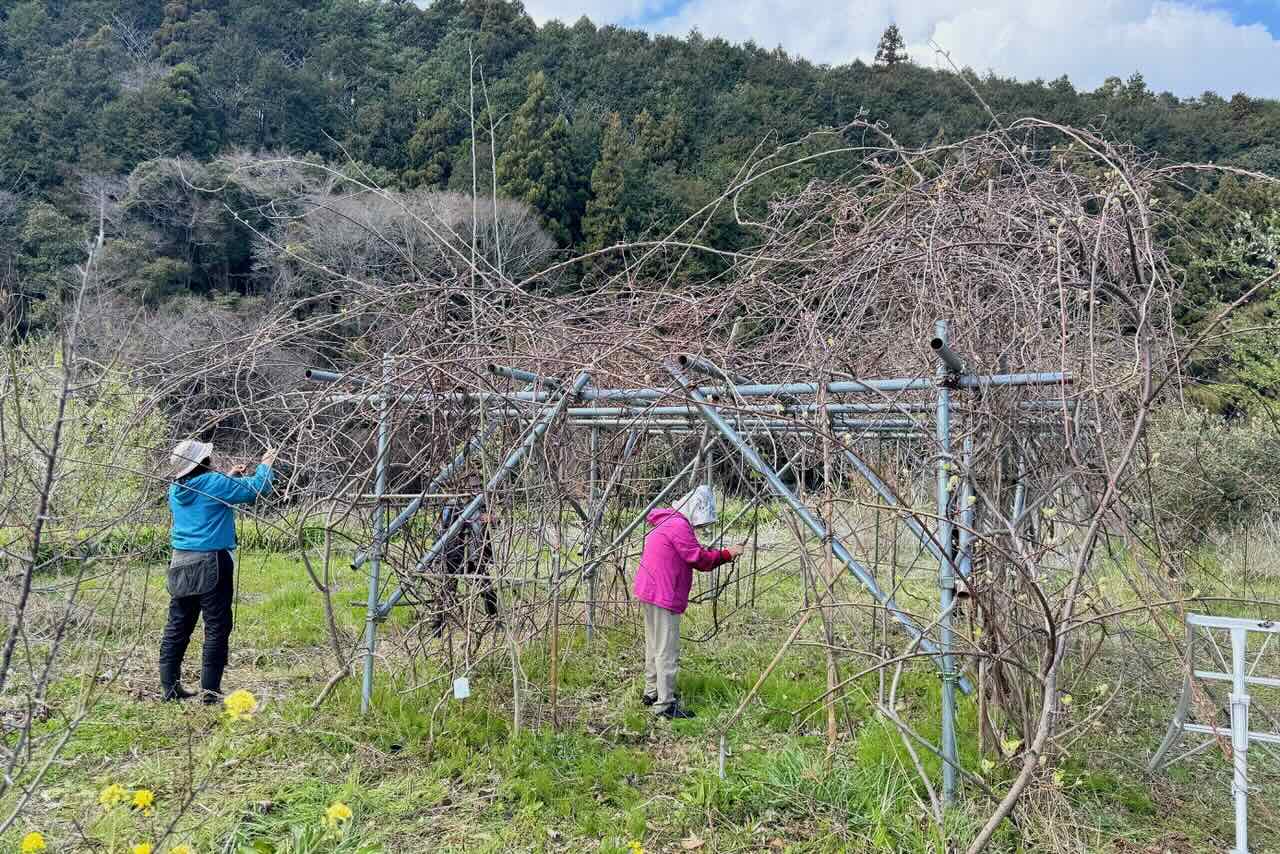 富士協生農園で借りている大きな畑のキウイの棚です。こちらの棚は昨年剪定を少ししかしなかったので、うっそうとしています。