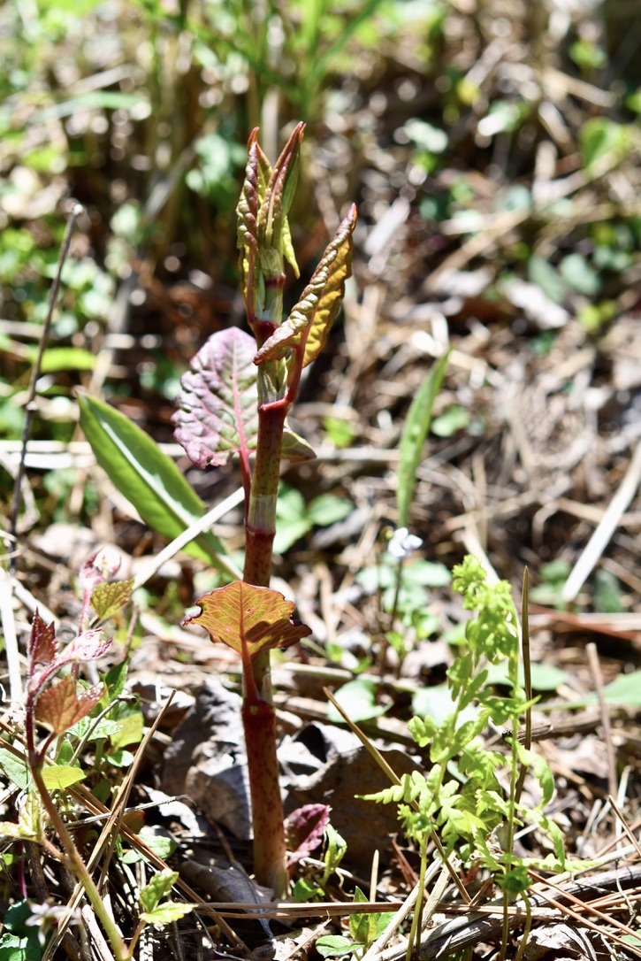 イタドリです。 野人さん(協生農法提唱者の大塚隆さん)もブログでイタドリの炒め物が美味しかったと書いてありました。伊勢市の方は大きく育っていますが、こちらはまだ出て来たばかりの小さなものばかりです。このくらいの方が美味しいかもしれませんが、もう少し大きくなるのを待って収穫し試食してみたいです。友人は、温かい富士宮の湧き水のそばで巨大に育ったイタドリを炒めて食べたら、イタリアンの味(どんな味?)だった、酸味があってとても美味しかったと言ってました。