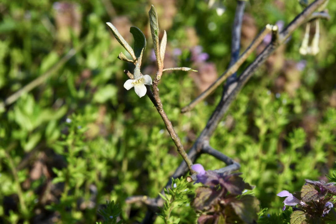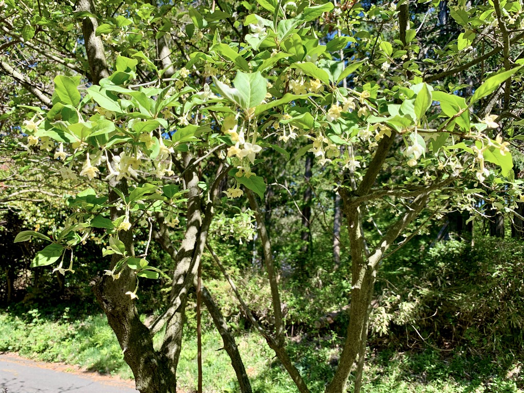 昨日の夕方、富士協生果樹農園の100m有用植物ゾーンに挿し木したグミに花が咲いていました。嬉しくて今朝、挿し木の枝をもらった親木を見に行きました。