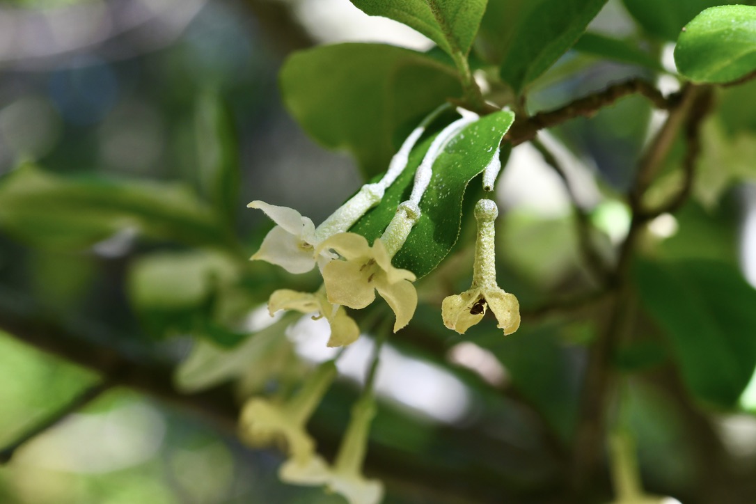 アップで撮ると、長い筒状の先に花がラッパのように咲いています。面白い形です。美味しいグミがたくさんなると良いですね。