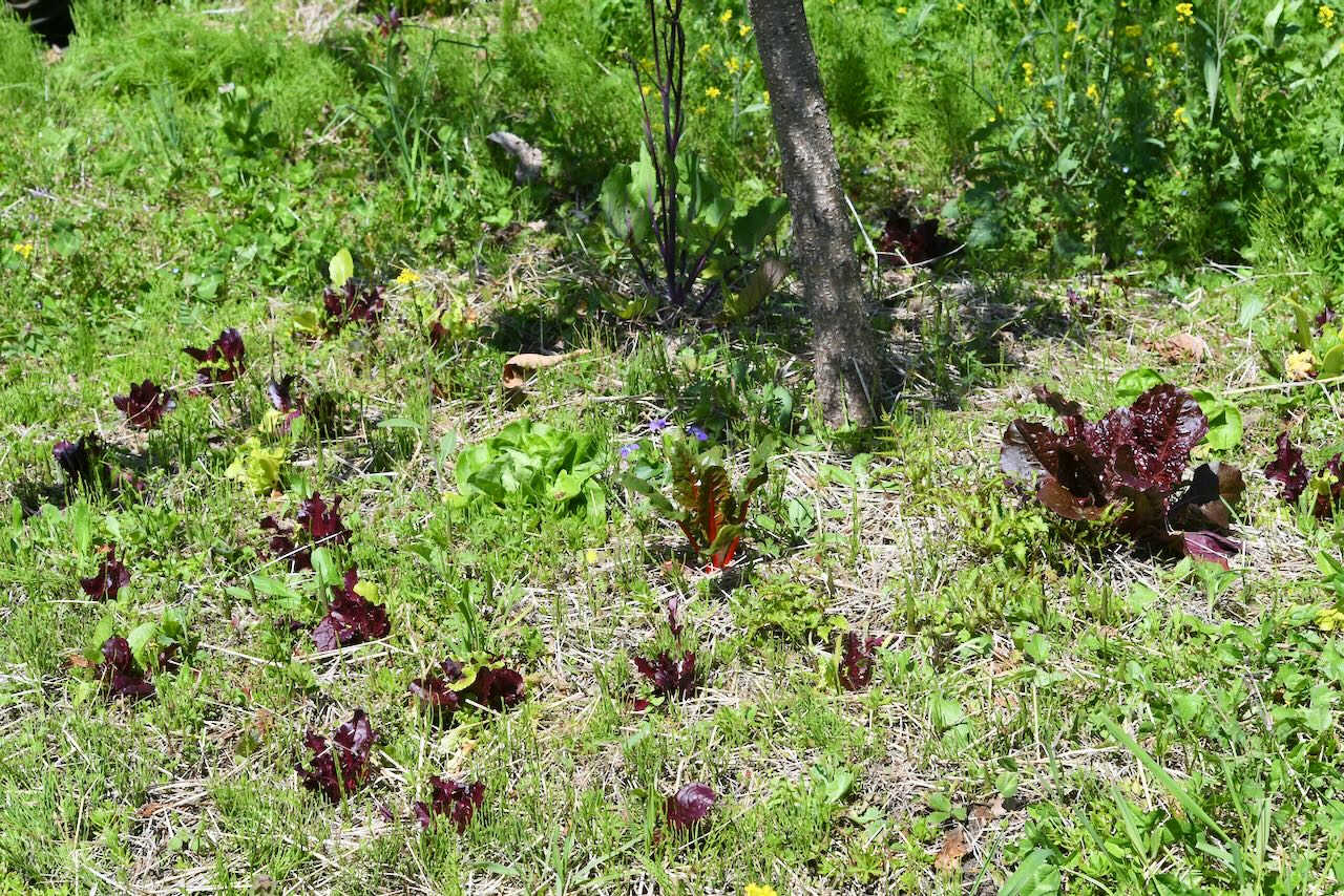 アンズの木の周りにリーフレタスの苗を植え、色々な野菜の種を蒔いた協生キットです。軽く草を刈り取りました。