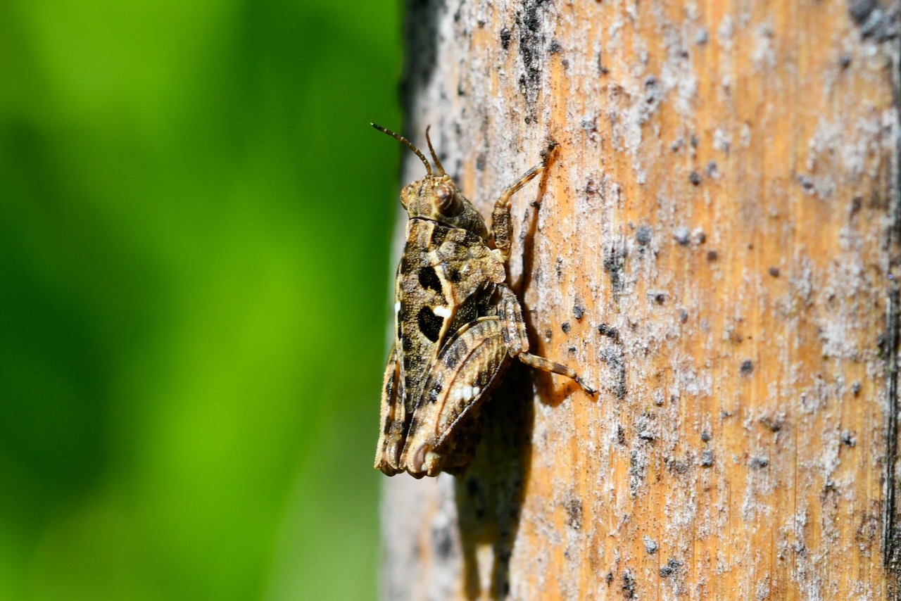 誰ですか? とっても小さくてコバエかなと思いました。1cmもありません7〜8mm位です。カメラで見ると地味な色とガラの虫さんです。ハラヒシバッタと言うそうです。