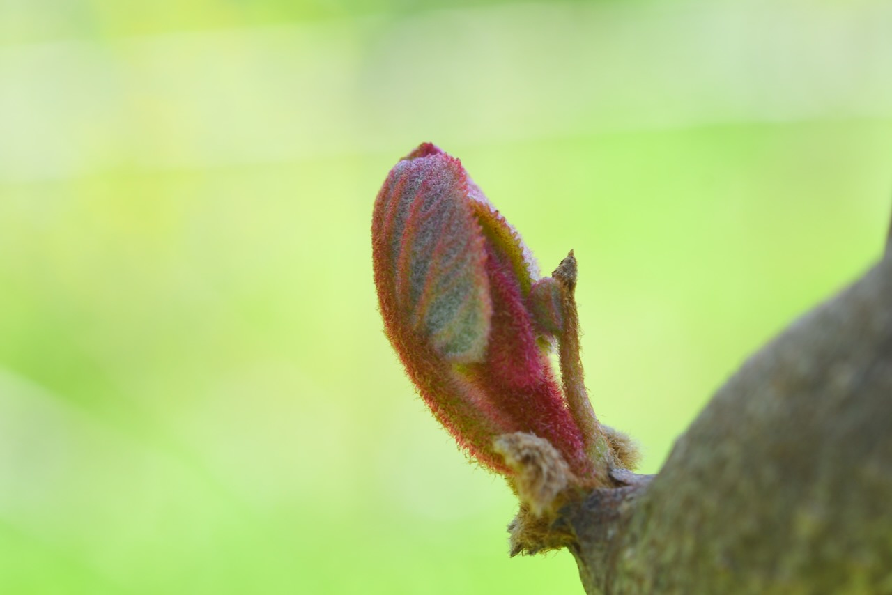 キウイの新芽です。綺麗な〜と思います。赤キウイだから赤いのでしょうか。