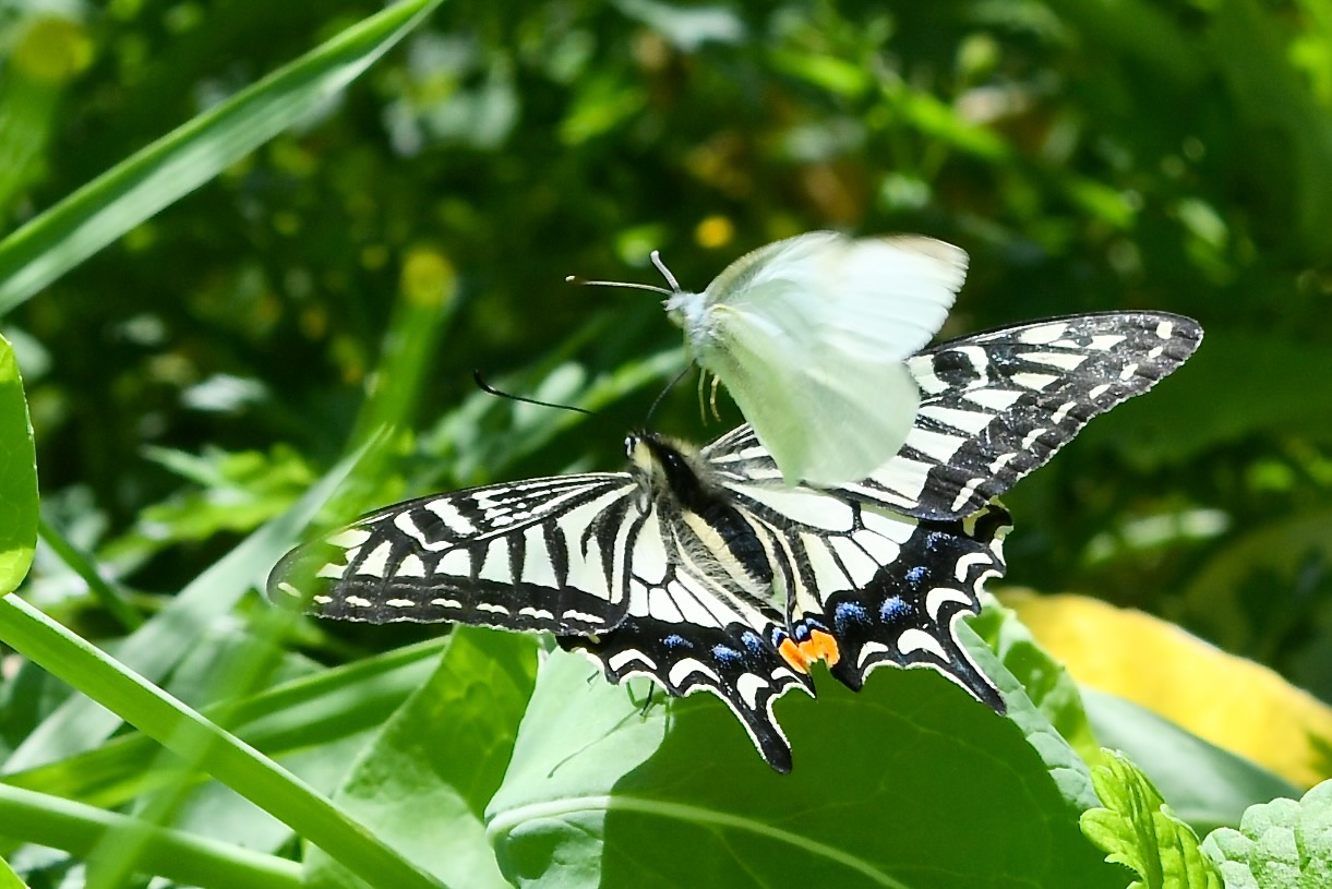 モンシロチョウとナミアゲハが仲良く飛んで来ました。長い間一緒にいました。モンシロチョウが積極的にグイグイ近づくというかちょっかいを出しているように見えます。
