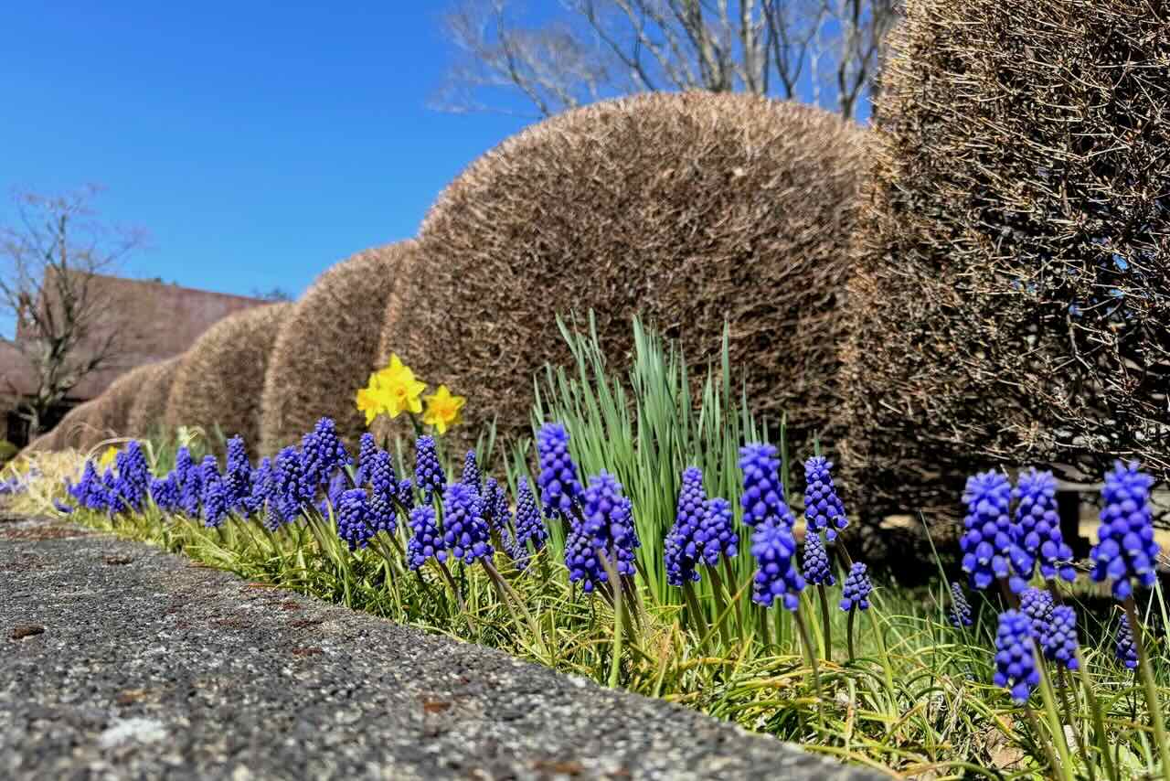 本館広場の垣根周りに咲くムスカリとスイセンです。