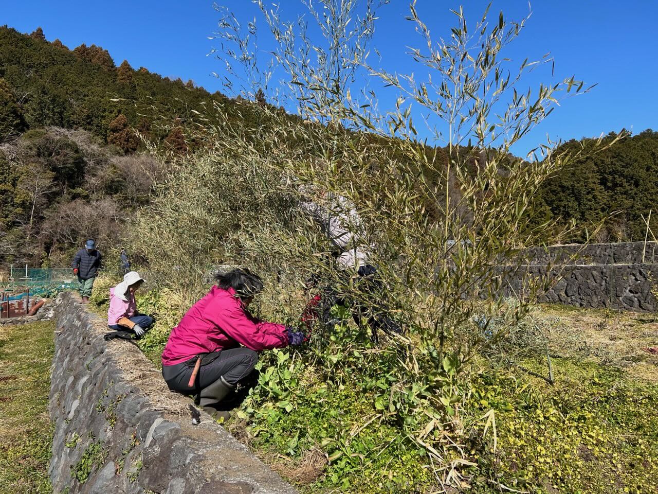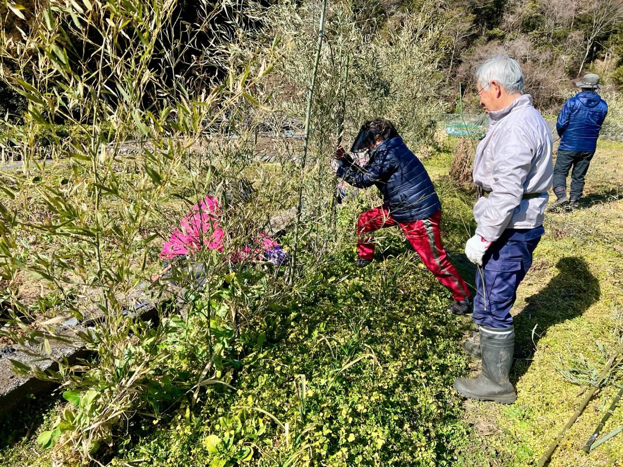 竹を刺しています。手前に竹がおいてあるのがわかりますか? ここへ来る前に皆んなで富士聖地に集まり、竹林から切り出しました。朝行くとすでにyukinoさんが前日に切り出してくれていたので助かりましたが、もっとたくさん持って行こうと、トラック一杯分ノコギリでカットしました。ここの竹はどんどん広がっているので、これ以上拡大しないように、支柱はなるべくここの竹を使おうと思います。直径が1.5〜3cm程のものにしましたが、いずれ太い竹も活用して行きたいです。使える竹がいっぱいあるのは本当に嬉しいです。