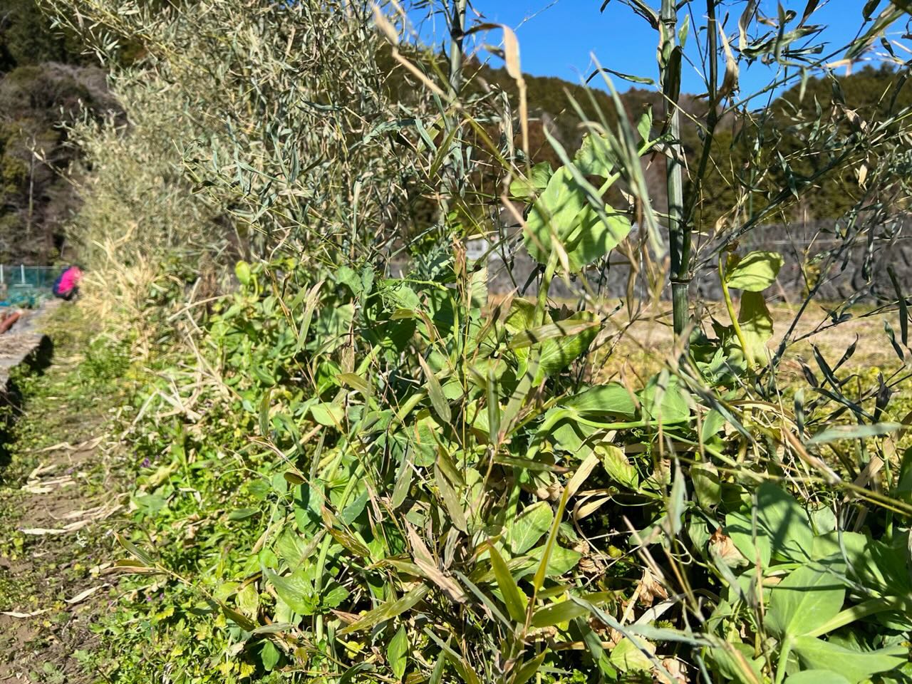 ぐるぐるになっているスナップエンドウを竹の枝にのせてあげます。男性スタッフが10月にニンニクやホウレンソウと一緒に植えたのですがちょっと早かったようです。霜に弱っているものや枯れているものもありました。生き残っている子は無事越冬してほしいです。