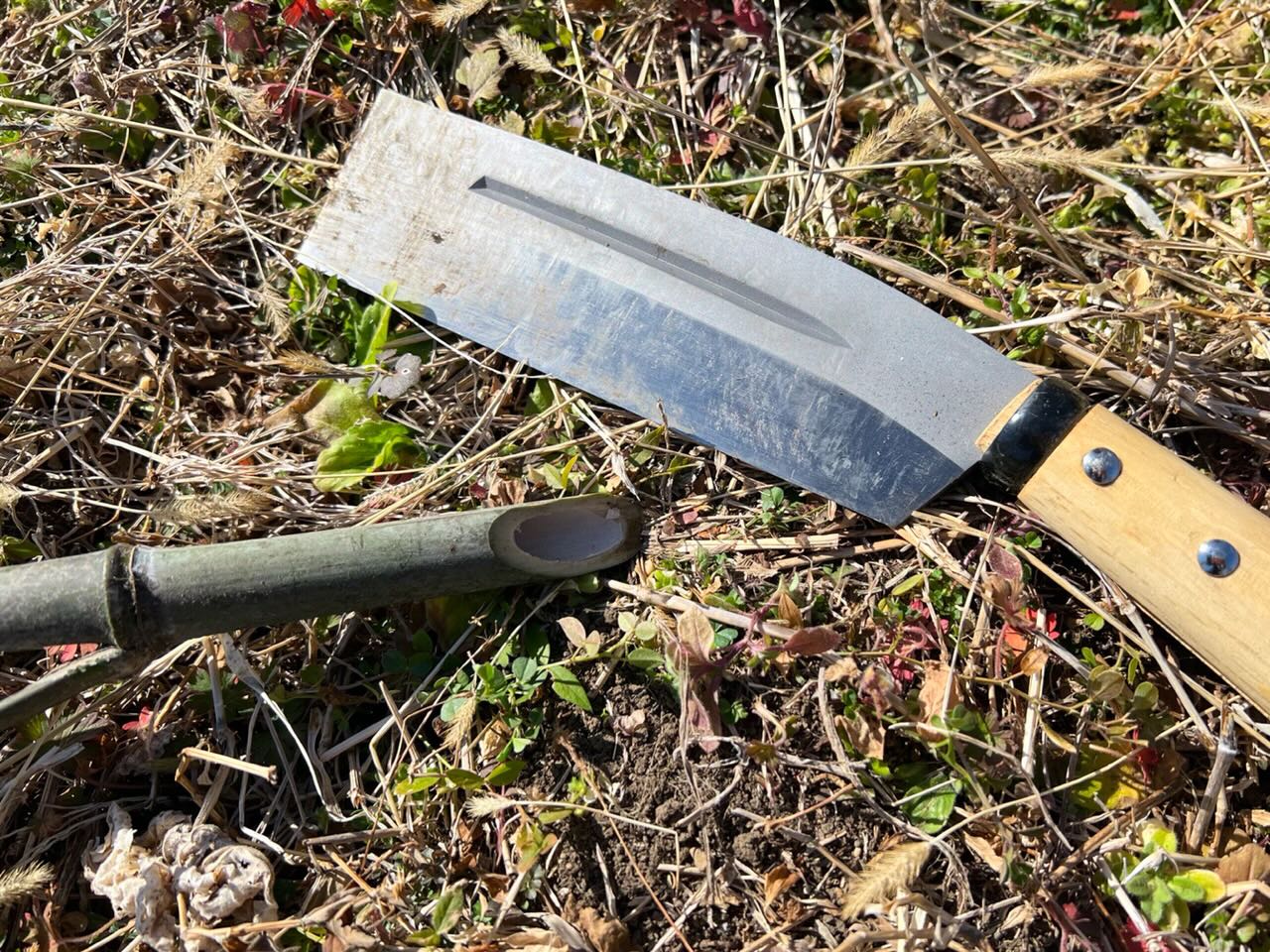 そこで差し込みやすいように竹を斜めにカットしました。必要になるかも知れないとナタを持って来ていました。スパンと切れます。普段ストーブの焚き付け用に細かく切るために使っているナタです。