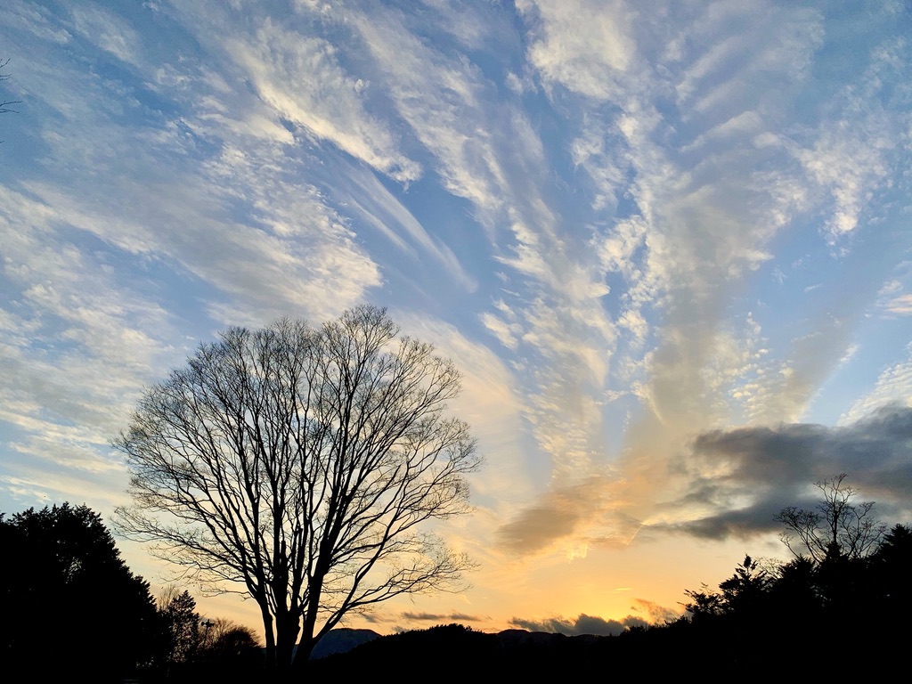 16時45分の本館前広場から見た景色です。事務所のゴミ出しに出る時、念の為スマホを持って出ました。まだ赤くなる前の夕陽ですが青い空とのコントラストがきれいなので撮りました。スマホを持って出て正解です。この後夕陽は赤くならず黒い雲で覆われてしまいました。一瞬のチャンスでした。