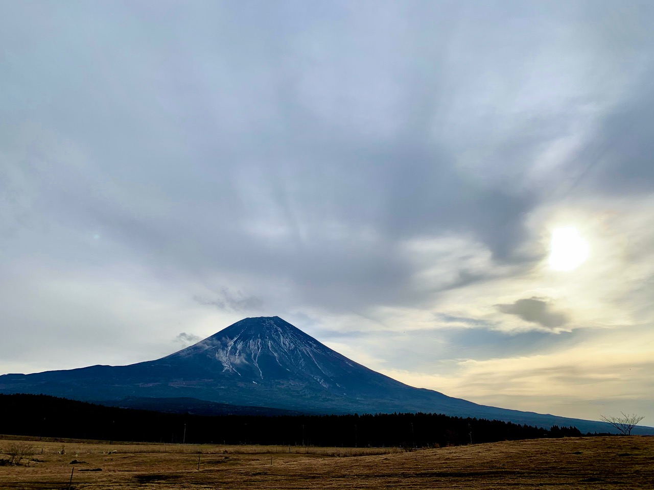車で5分走って富士聖地に着くと、富士山の全身が見えました。太陽は雲の中です。5分走るだけで随分見え方が違います。