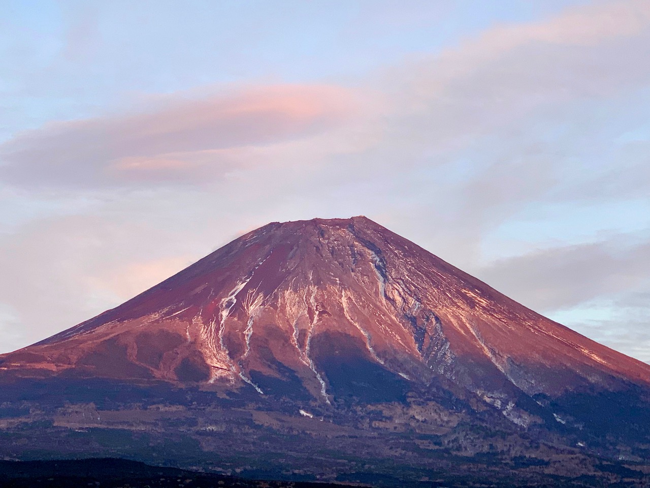 今朝の富士山です。雲が多いので見えないかもと思いましたが、頭が出ていました。