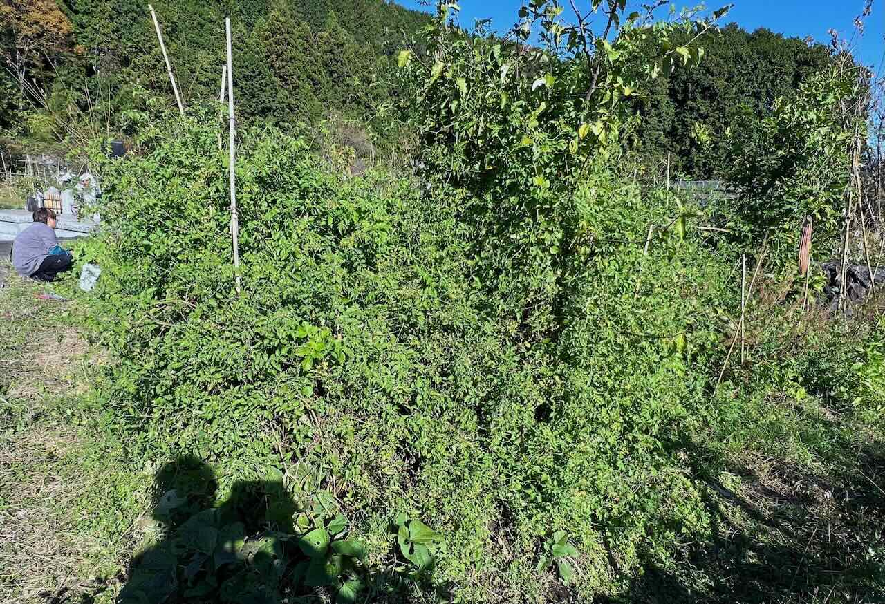 16日は女性陣4人で精進川の畑に行きました。これはマイクロトマトのブッシュです。見えるところのものは取りましたが、奥の方にまだまだ赤い実があります。手を突っ込んで取ろうとしても触った途端ポロッと下に落ちてしまいます。