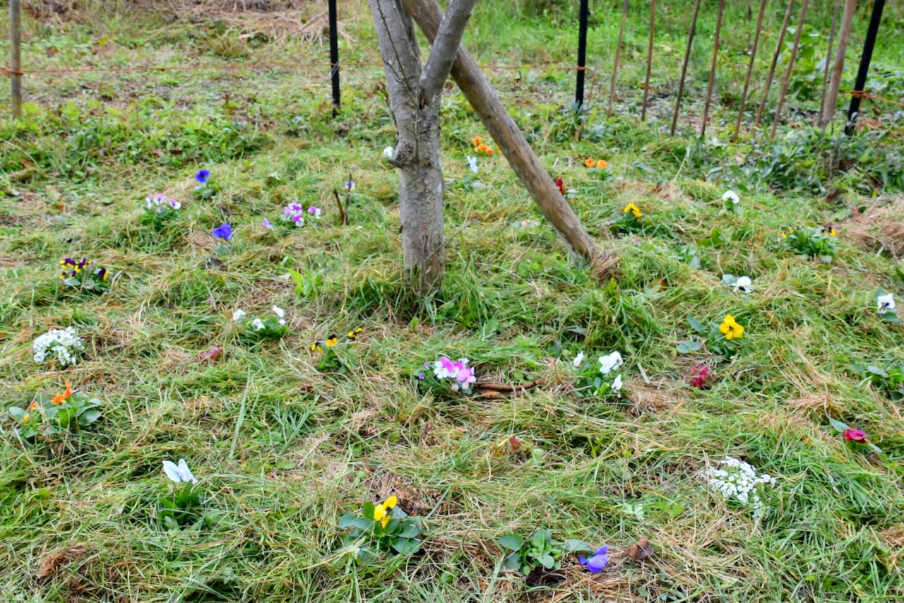 先日、安田さんとロープを新しく張り変えた、リンゴの木の柵の中に、花の苗を植えました。