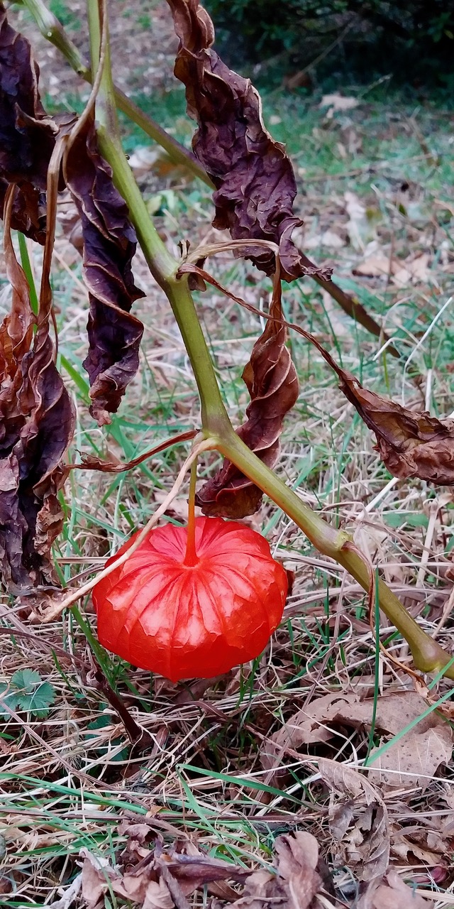 植物に詳しいYさんが、写真を送ってくれました。メッセージには「今日、別館と第一倉庫の間で、ホオズキを一輪見つけましたので、写真を送ります。葉は枯れても実は元気!」と書かれていました。富士聖地のホオズキを初めて見ました。あざやかな色ですね。