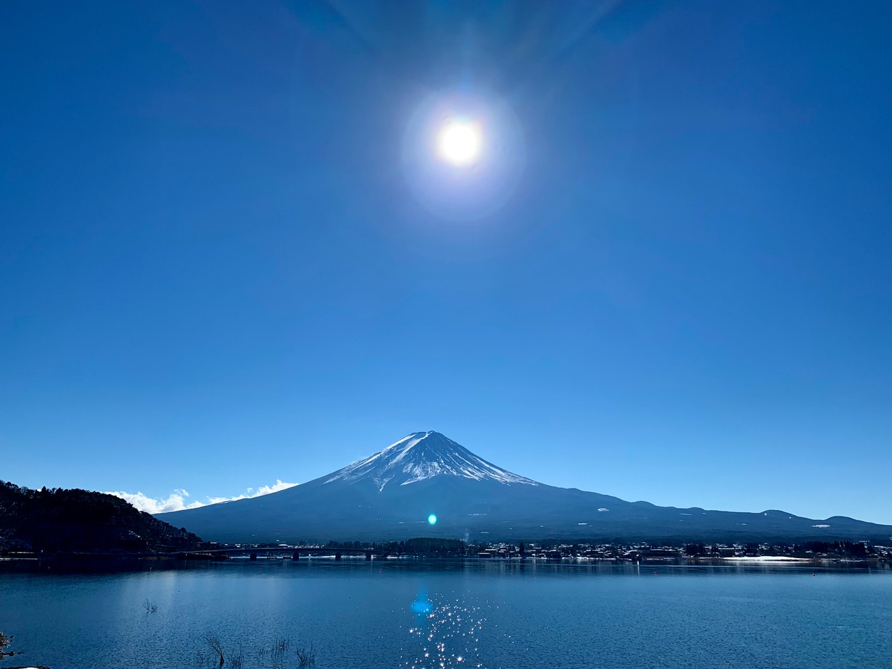12時40分頃、雪のある富士山を撮ろうと河口湖へ行きました。陽射しが強く眩しかったです。湖畔に観光客は一人もいなくて音の無い静かな空間でした。思いっきり深呼吸をしました。