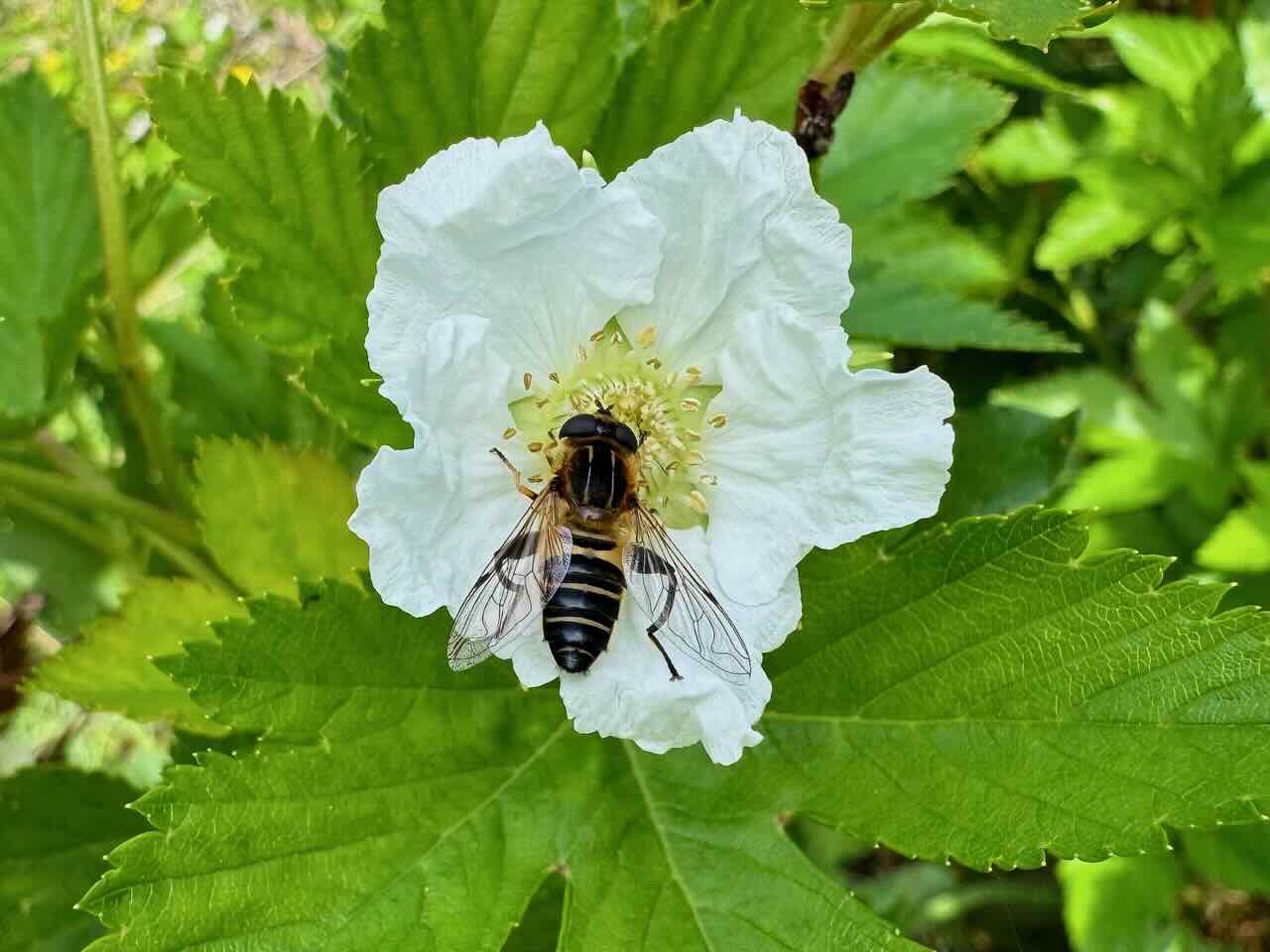 カジイチゴの花とアシブトハナアブです。今回はお話が中心で花を撮ることは無いと思って、一眼レフカメラを持って来ませんでした。全部スマホで撮ったのでいつもより画質が良く無いですが仕方ありません。