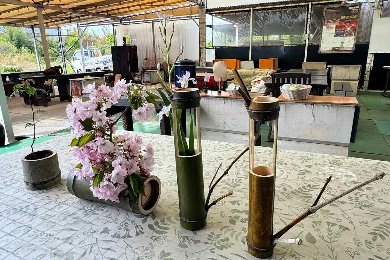 部屋に移動すると、竹の花器に花が生けられていました。良いですね、作ってみたいと思いました。