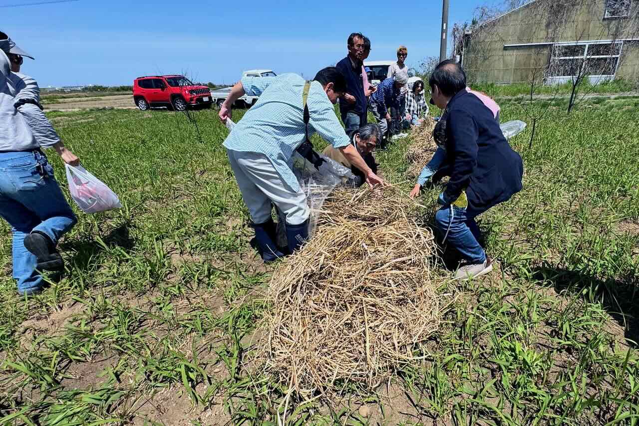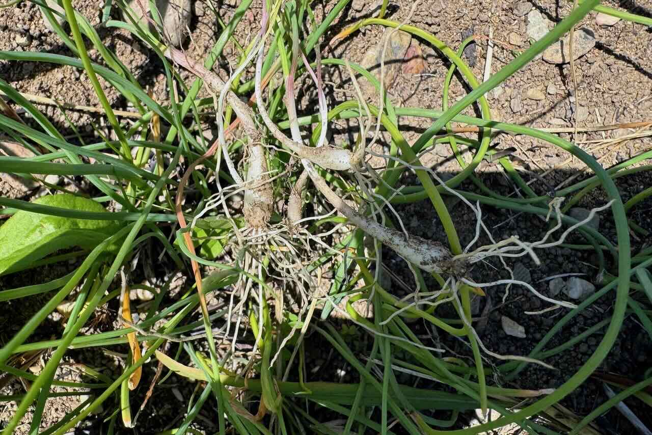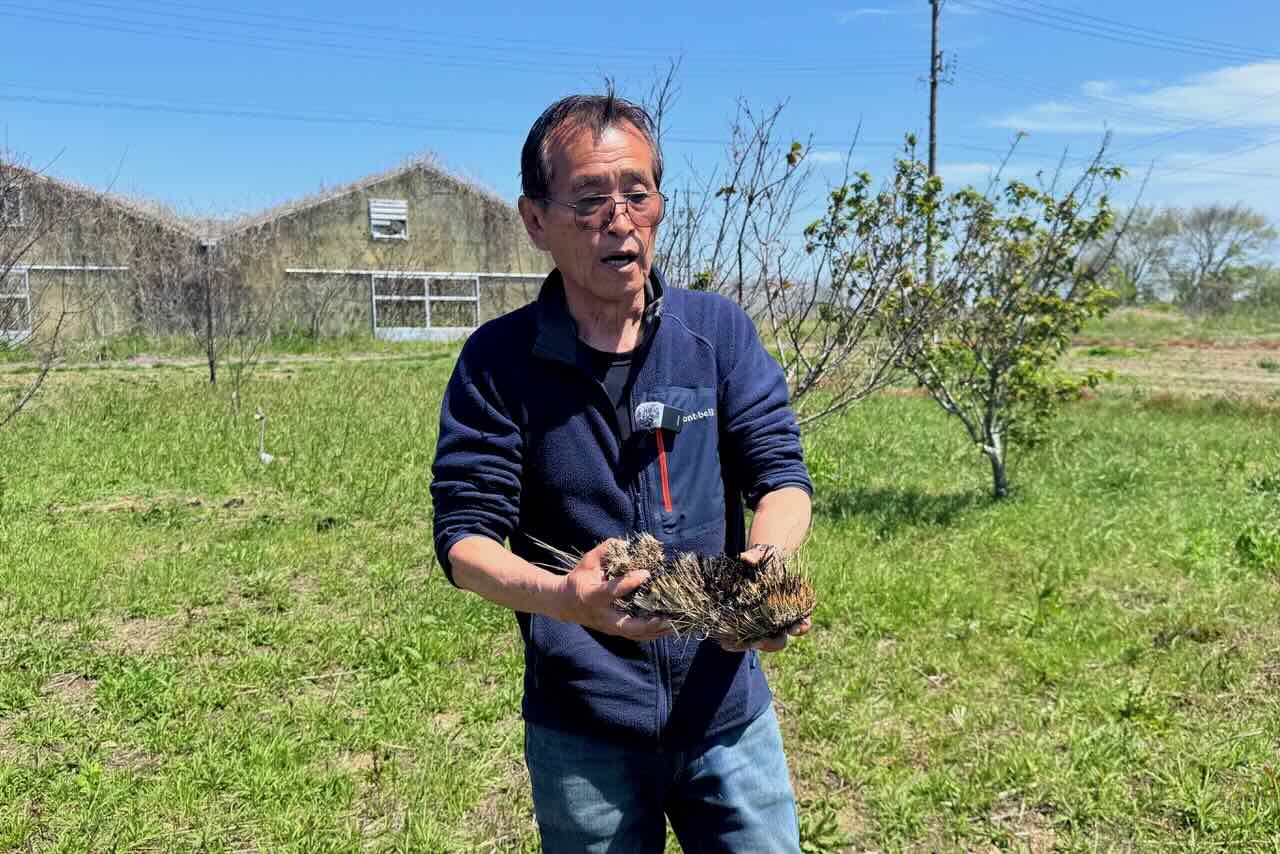このもやしのように細いシマラッキョウですが、シマラッキョウの畝の真ん中にゴボウの種を蒔いたそうです。ゴボウは2m近くまで伸び、大きな葉っぱで陽光を遮るのでチガヤの勢いを止めるので、たまに草刈機でチガヤをカットすれば、シマラッキョウは命を吹き返すそうです。