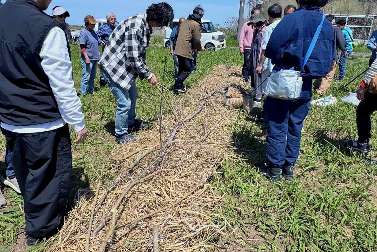 その上にクワの木のカットした枝を被せていきました。今後青草が生えてきたらカットしてこの上に被せます。