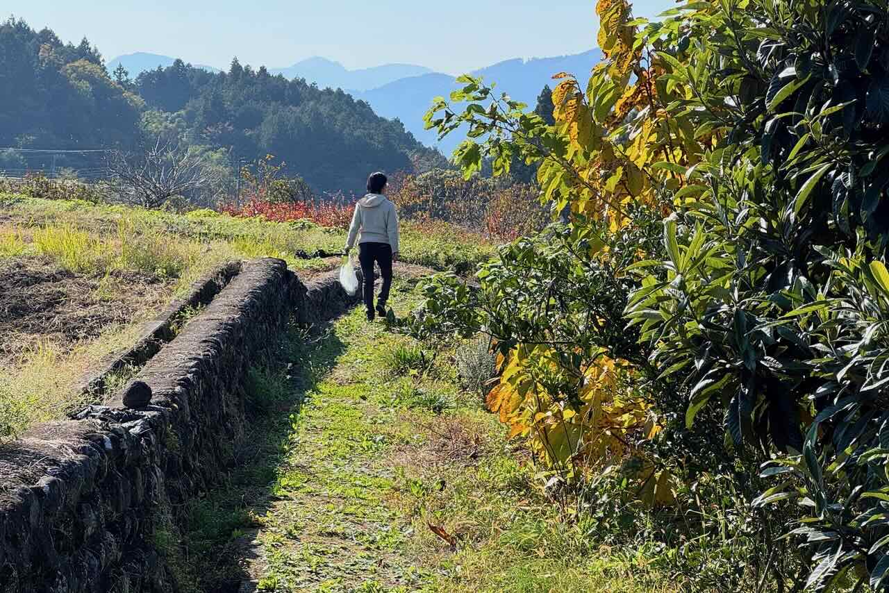 講習会翌日の16日です。協生農法講師の4人の方が、帰路に精進川の畑に寄りました。森さんが木にぶら下がったムクナ豆を見ています。