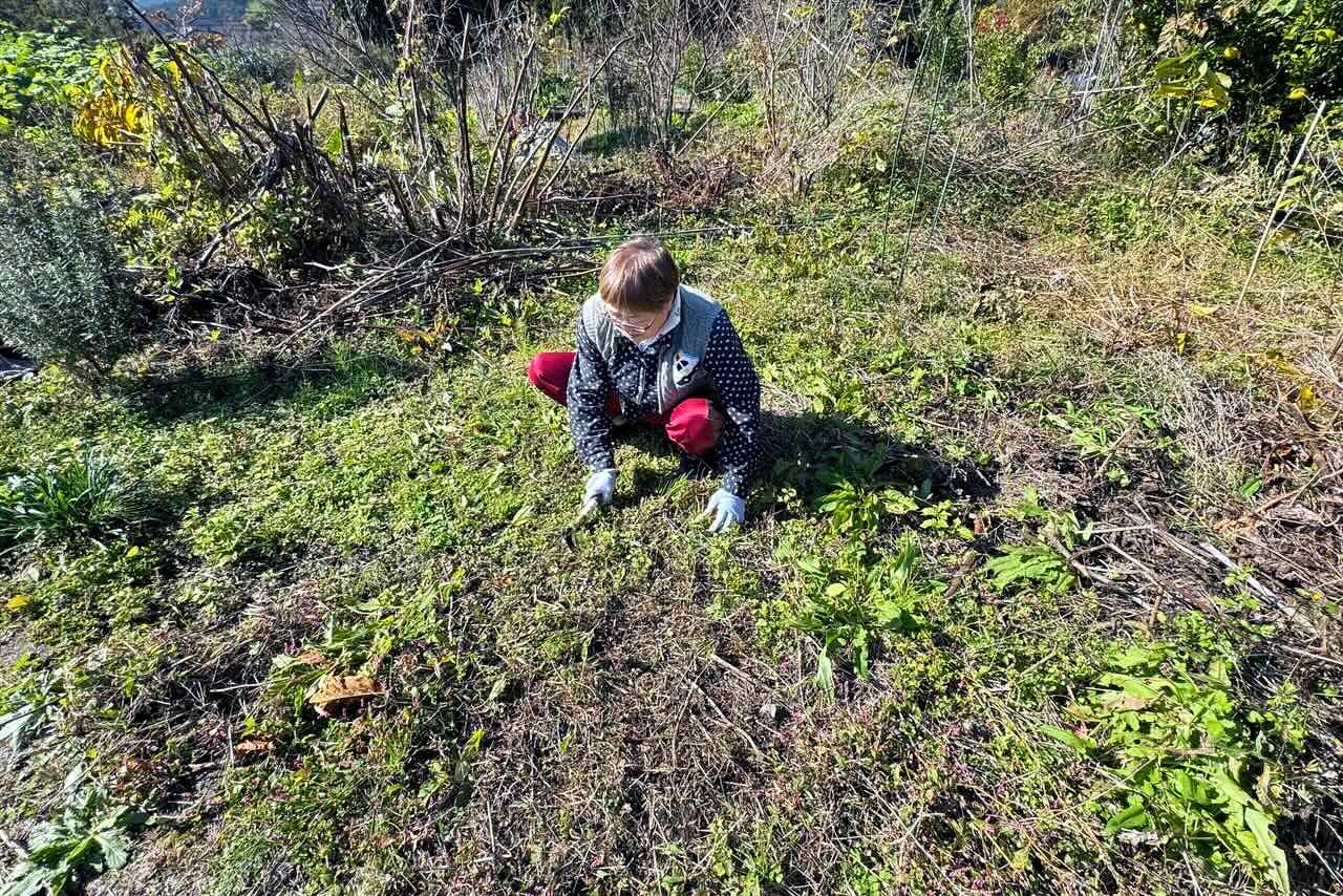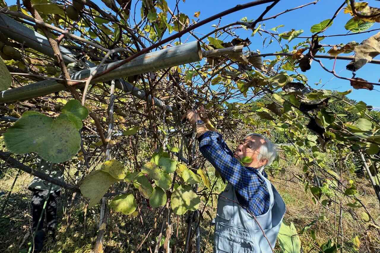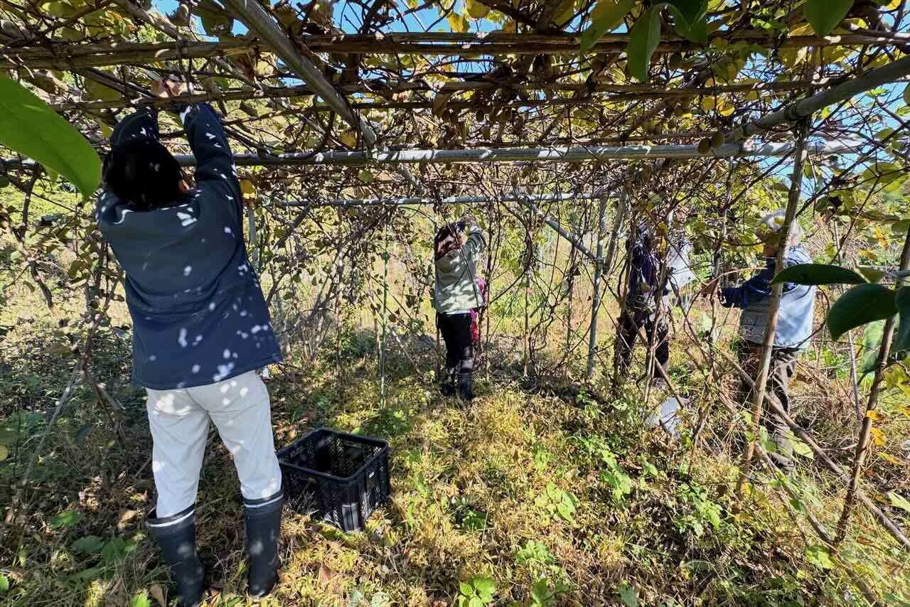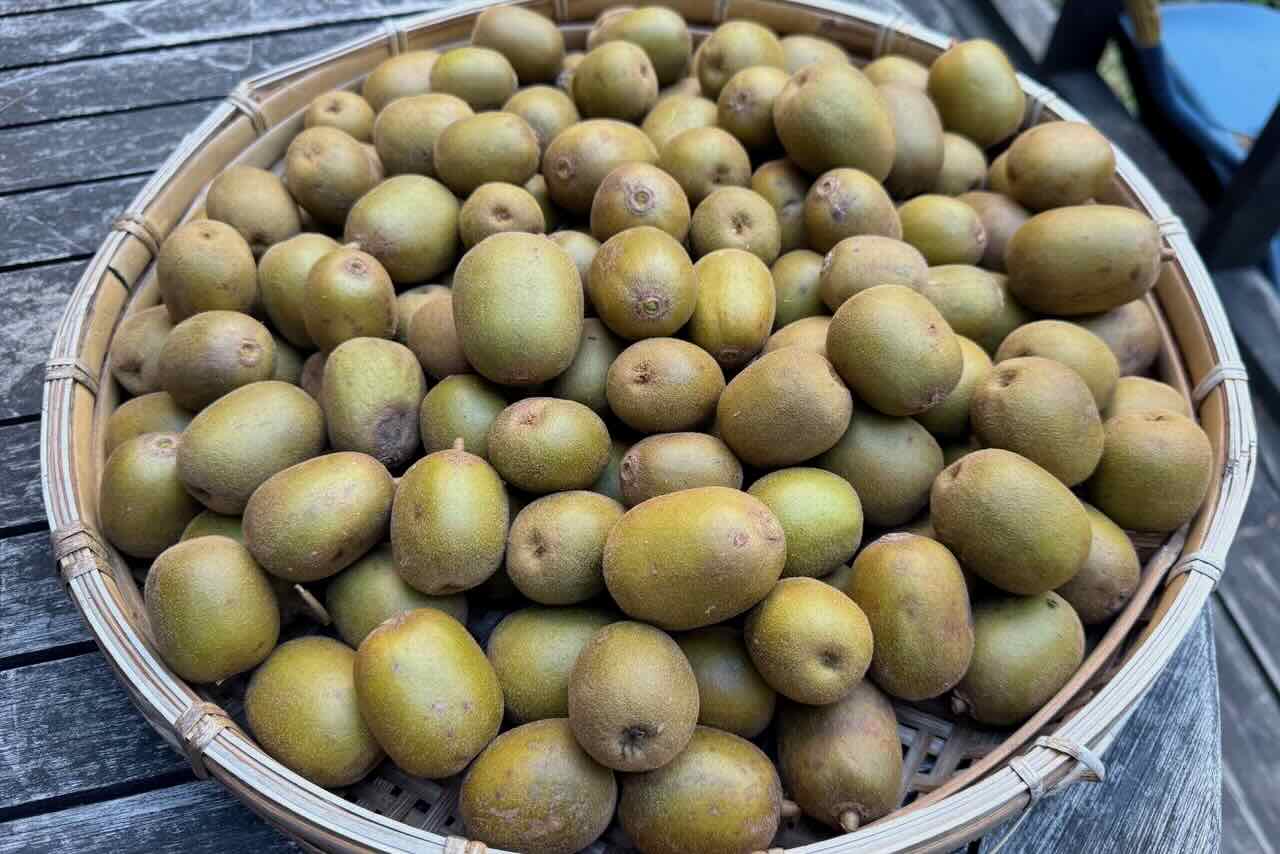 皆さんが帰った後、せっかく来たのだからと、女性陣の棚からキウイを収穫しました。鳥さん達の分を少し残しました。