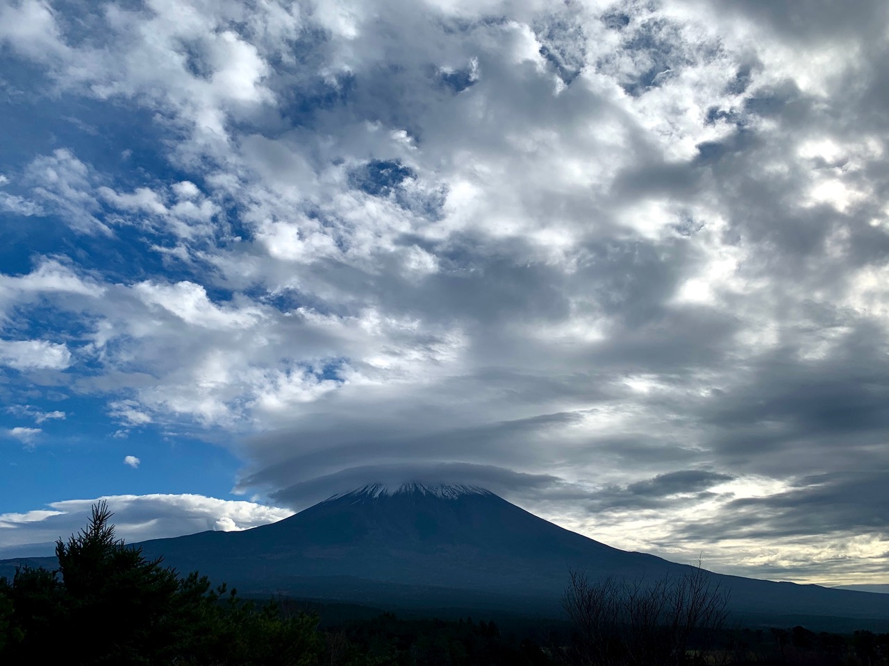 富士山は相変わらず笠雲を被り、上空もたくさんの雲に囲まれていました。明日は雨かもしれません。