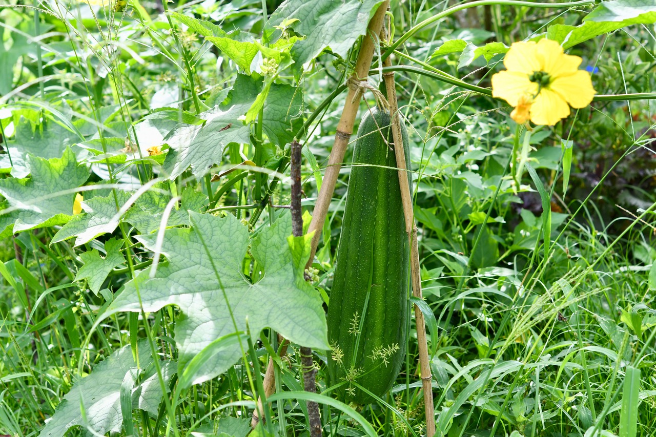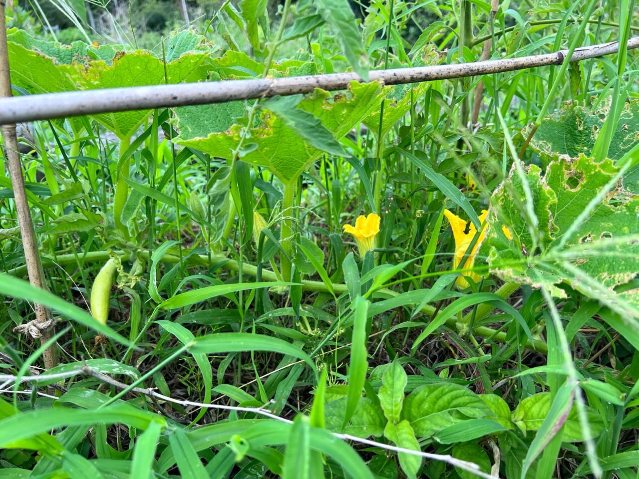 このモウイも自由に伸びています。この1段目の共有の畑には、モウイ、ヒダカボチャ、ヘチマを各6本づつくらい植えていますが、場所によって生育が違います。ヒダカボチャは4本ダメになりました。ヘチマとモウイはこじんまりした子と大きく広がっていく子といます。これは肥料をあげていないからこそわかる各場所の土壌の違いだと思います。