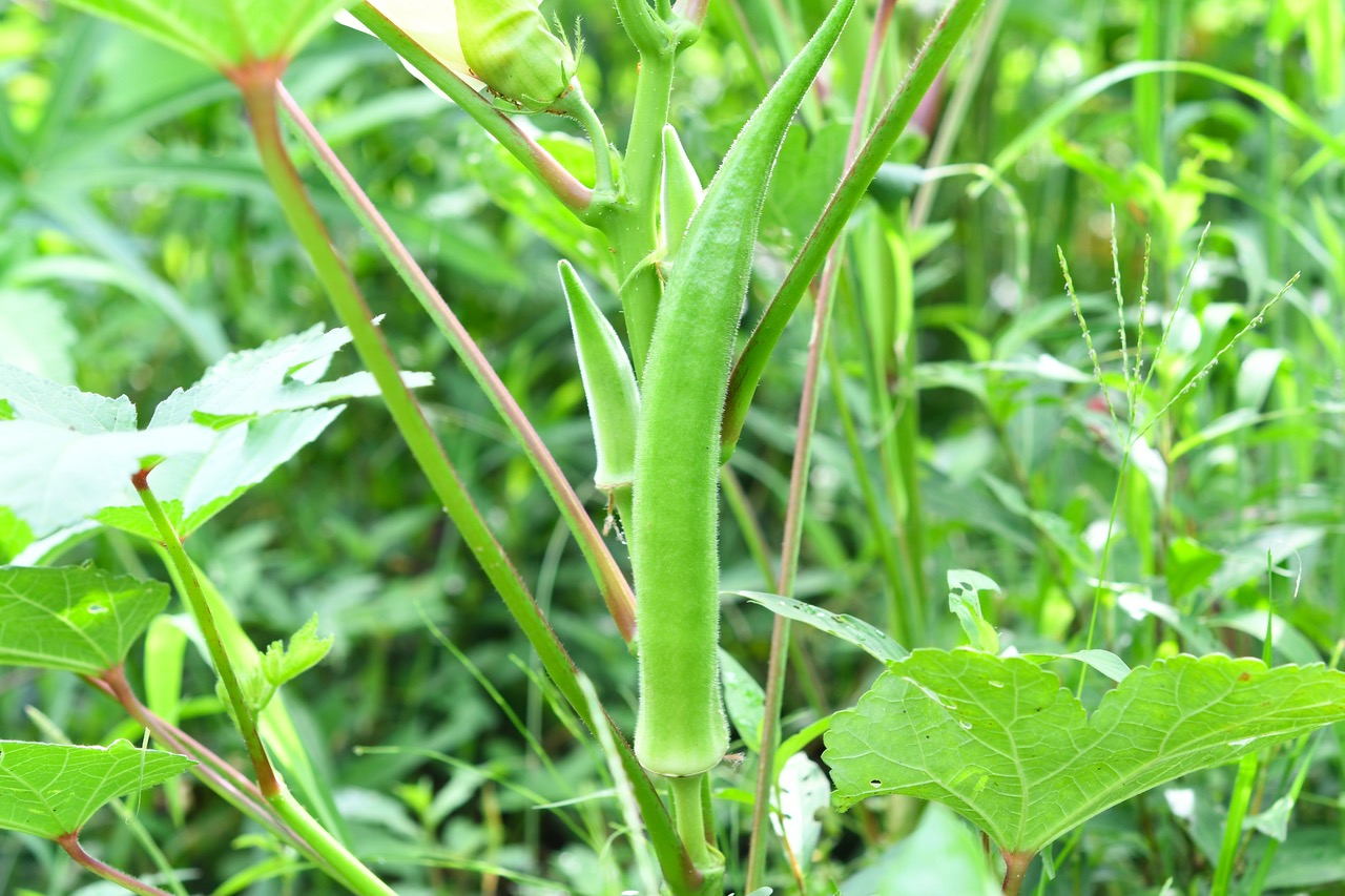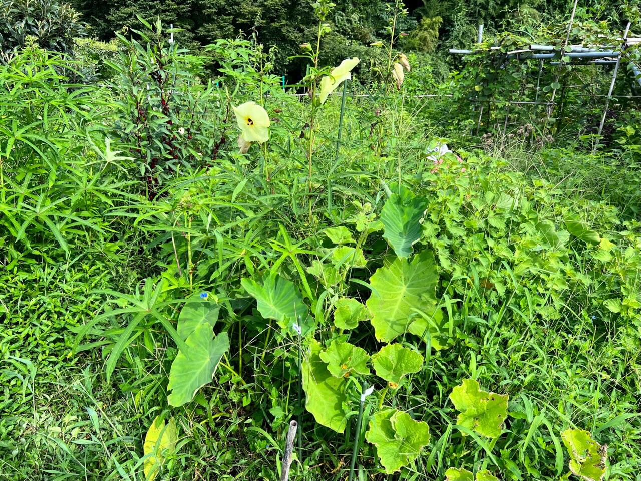 この小さな畝には、ローゼル、花オクラ、サトイモ、ヒダカボチャ、シソが育っています。