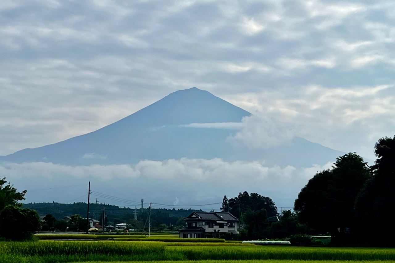 富士聖地がある富士西麓の富士山は雲に隠れていましたが、精進川では曇り空ですが姿が見えました。稲が育っています。