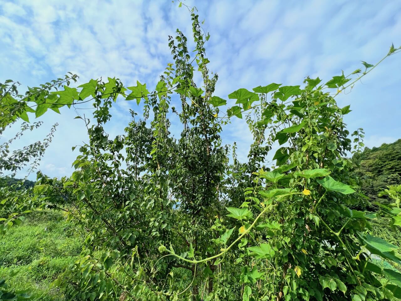 精進川の1段目の畑です。左からヘチマ、右奥からモウイのつるが梅の木に巻き付いています。