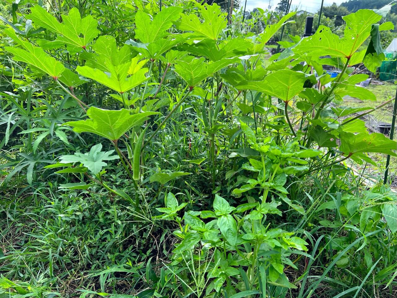 ここは苗床でしたが、移植できずに残ったシマオクラや花オクラ(写真左奥)、バジル(写真手前)が育っています。
