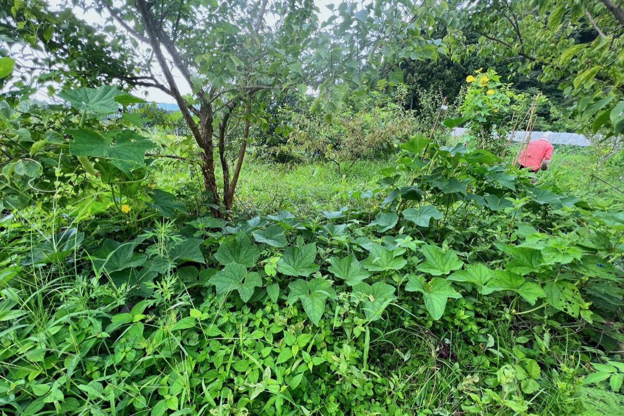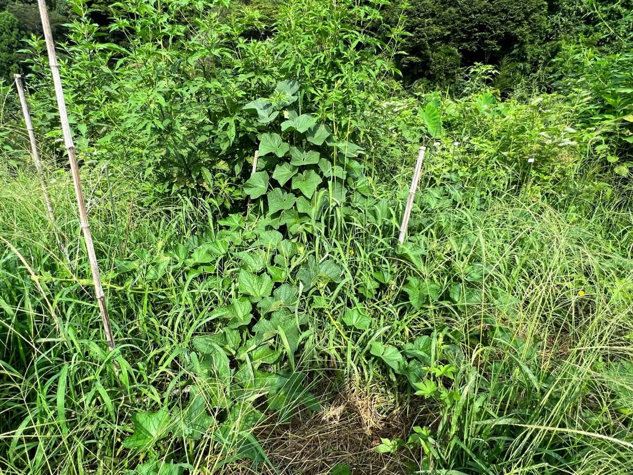 大きな棚がある富士協生果樹農園の畑です。女性陣が育てた固定種のモウイの苗を3本植えましたが、後の背の高いオオブタクサに巻き付いています。