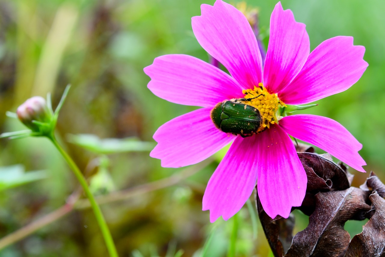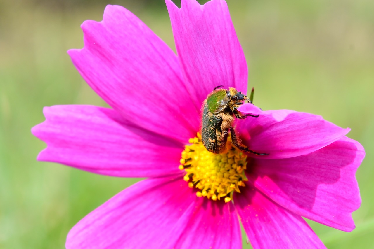 2年前に種をまいたコスモスが昨年も少し育ちましたが、今年も少しだけ花が咲きました。こぼれ種から毎年咲く事を期待したのですが、牧草地に鎌でスジをつけて蒔いただけなので、次の年は牧草にほとんど負けてしまいました。でも何本かですがまた咲いてくれて嬉しいです。綺麗なピンクの花にコアオハナムグリがいました。