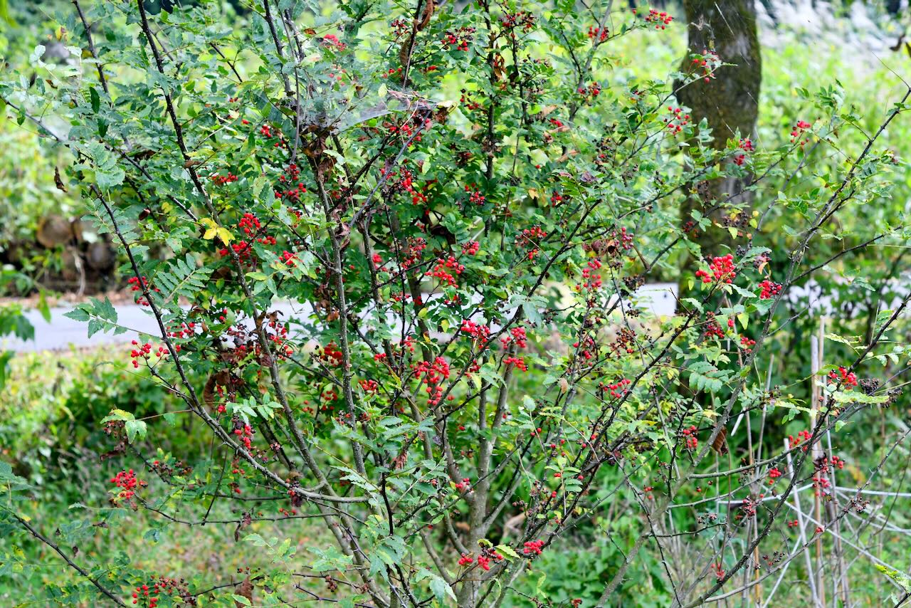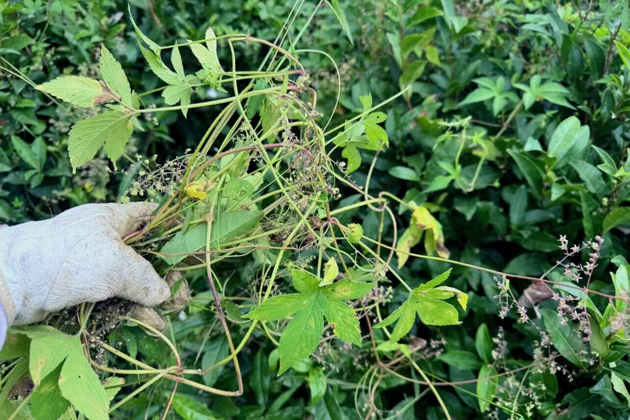 さあここから作業です。花が美しいので30分も撮影してしまいました。私は茶の木に沿って蒔いた野菜の種の周りの草を刈り、茶の木の上に覆い被さっているカナムグラを引き剥がしていきました。しっかり絡み合っているので、引っ張るのは力が入ります。