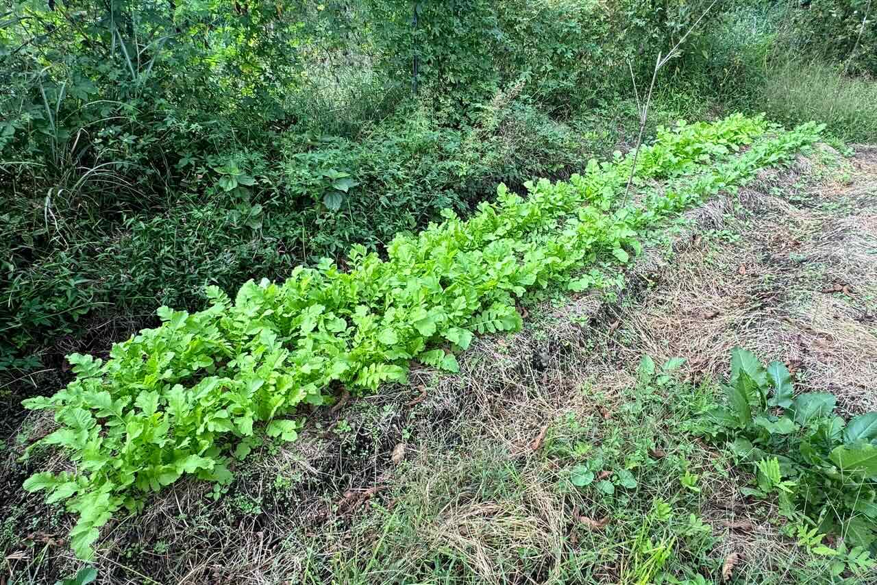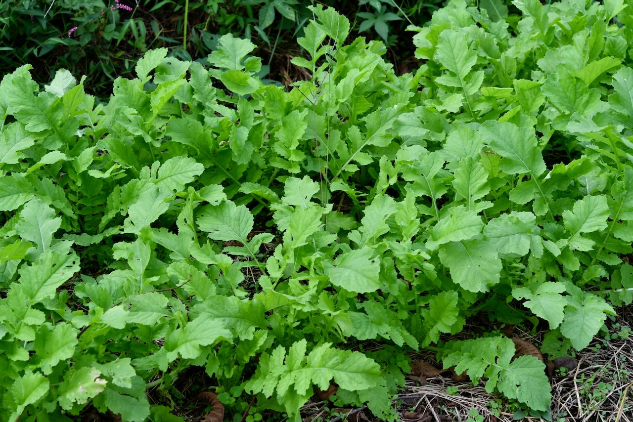 8月14日に茶の木の側に蒔いた野菜の種は発芽していますが、成長が遅いです。シュンギクとサニーレタス、サラダ菜、チマ・サンチュ、冬菜、小松菜の種をボウルに入れて混ぜて蒔き、その後に1種類の種を1mづつ蒔いています。6種類の種を混ぜて蒔いたところは小松菜が多く出ていました。1種類づつのところは冬菜とサニーレタスは大きくなっていました。