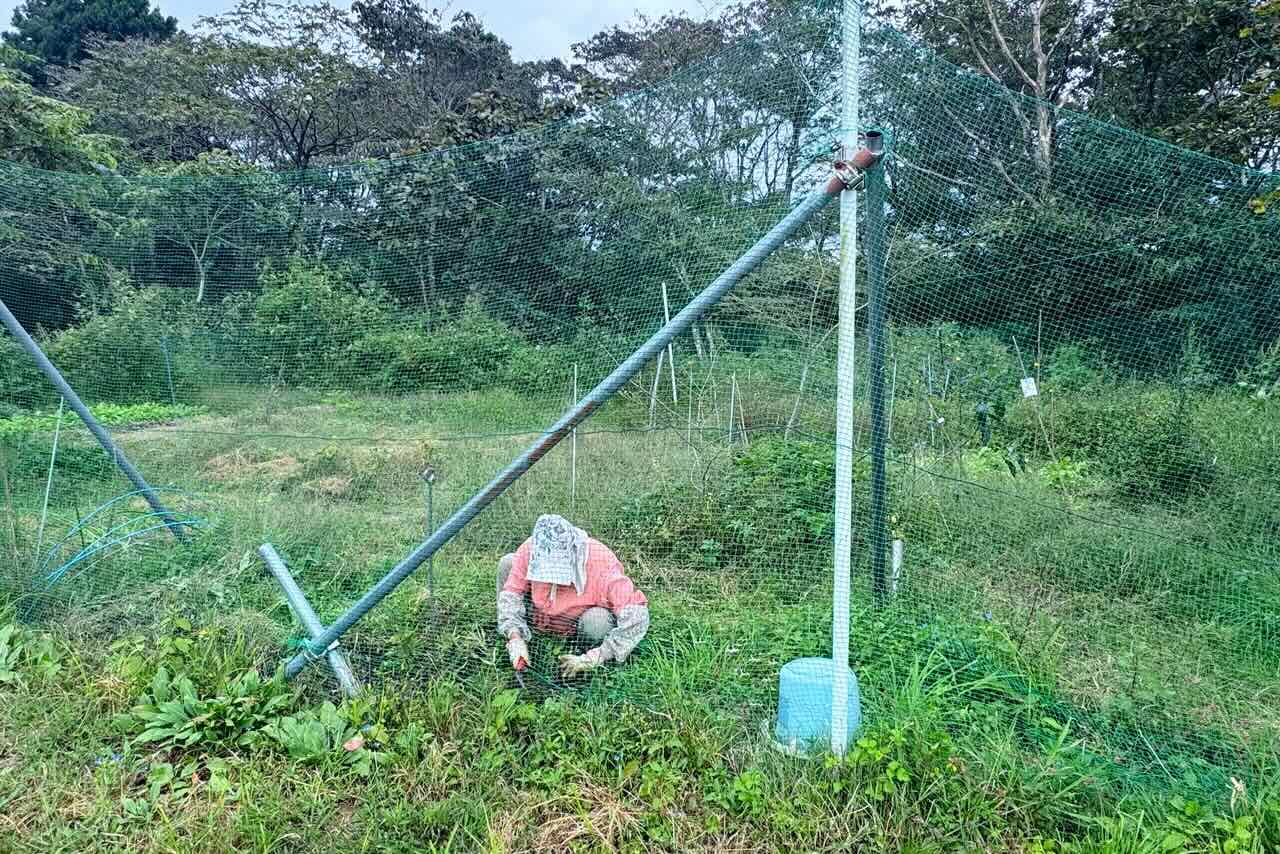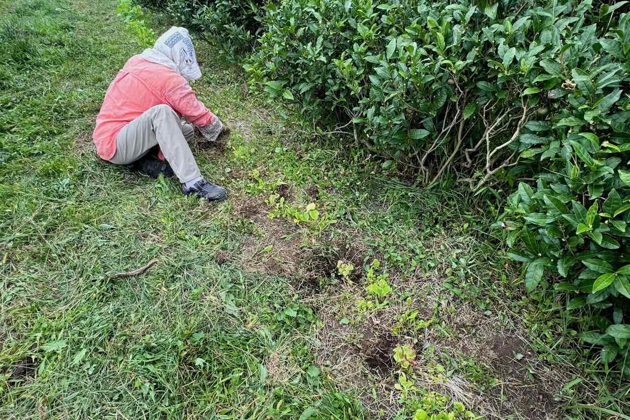 柳田さんの方は、茶の木の奥にある、ネットで囲んだ畑のネットのきわの草刈りをしています。私は後から草刈機で畑の中を全部刈りました。