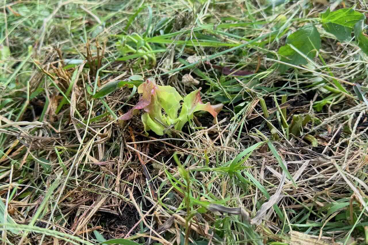 サニーレタスの小さな苗です。水をやった後に草を被せました。