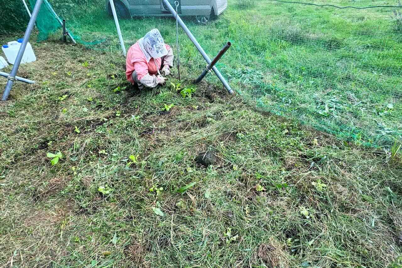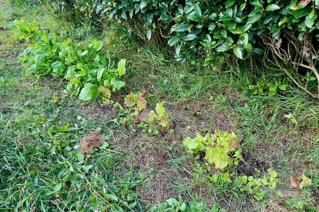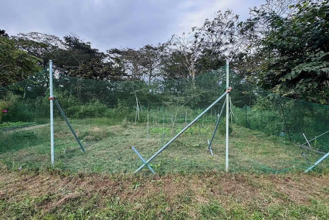 草を刈ったネットの側に、自宅で育てた、サニーレタスとチマサンチュ、サラダナ、ハクサイの苗を2人で移植しました。