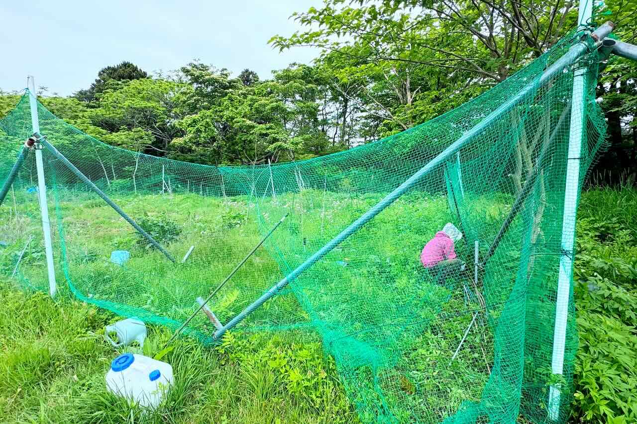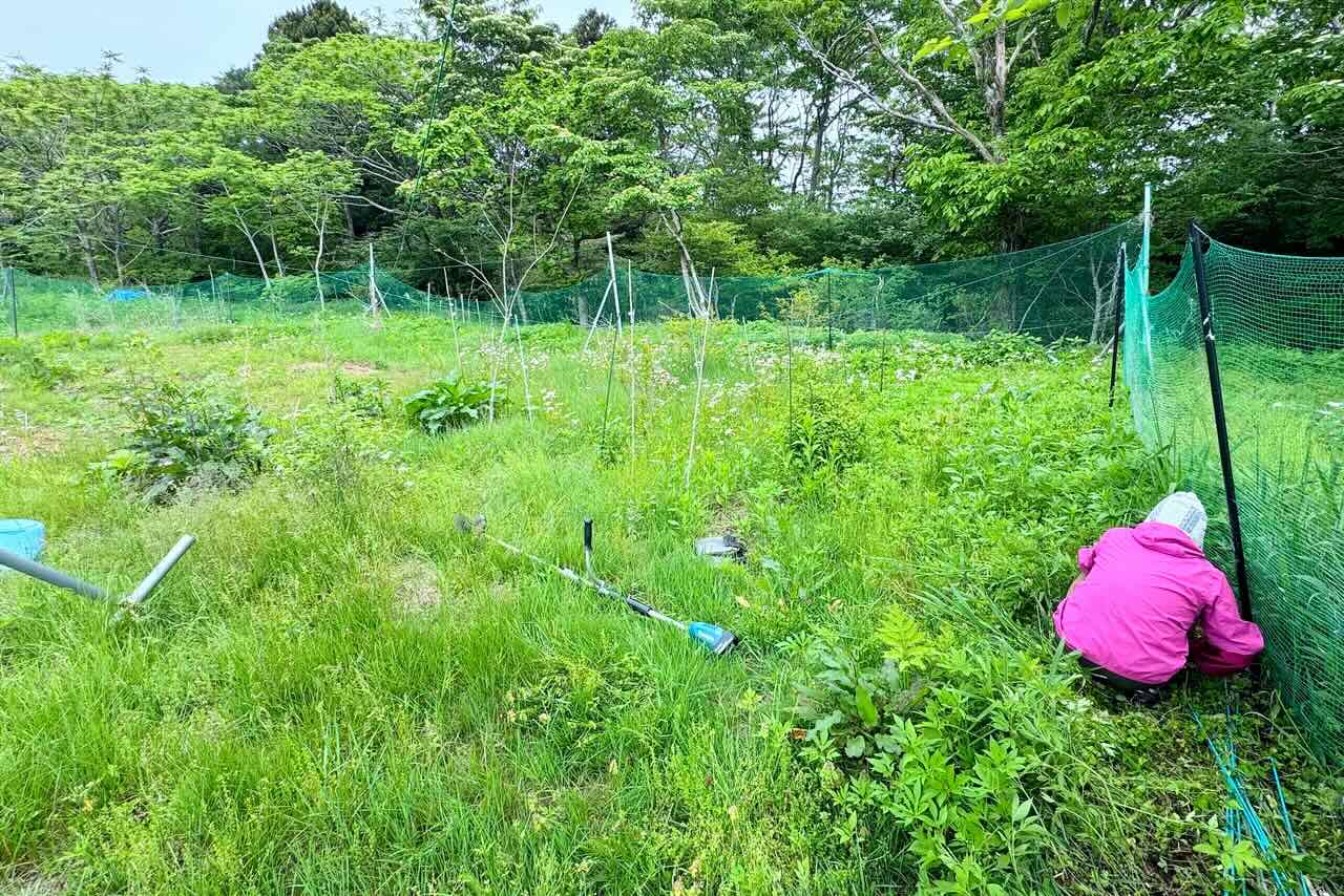 まずはネットで囲われた畑の草刈りです。柳田さんが手鎌でネットのきわを刈って行きます。